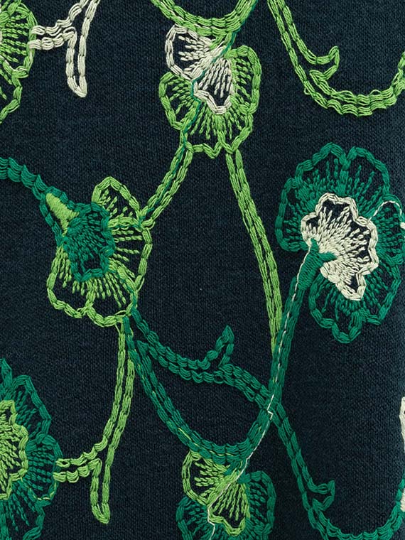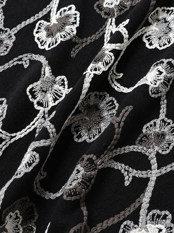 3色の糸を使い、何本ものステッチを丁寧に重ねることで、まるで絵画のような、太く力強いラインで花々が描かれています。