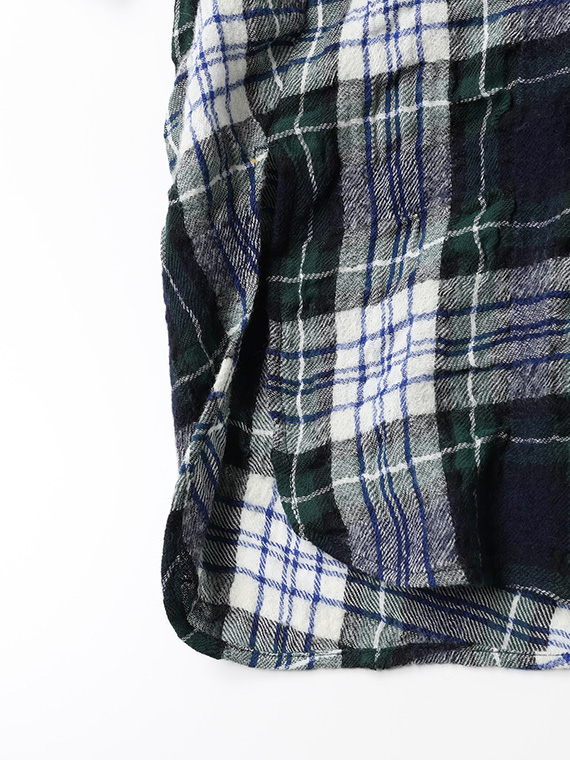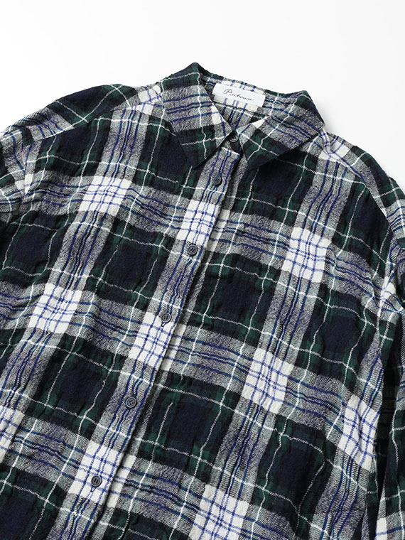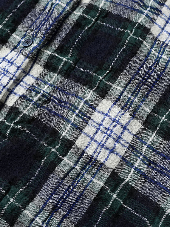 平坦ではない、奥行きのある独特の表面感が、単なるチェック柄をワンランク上の洗練されたテキスタイルに変え、クラシックな柄にカジュアルな抜け感を与えています。