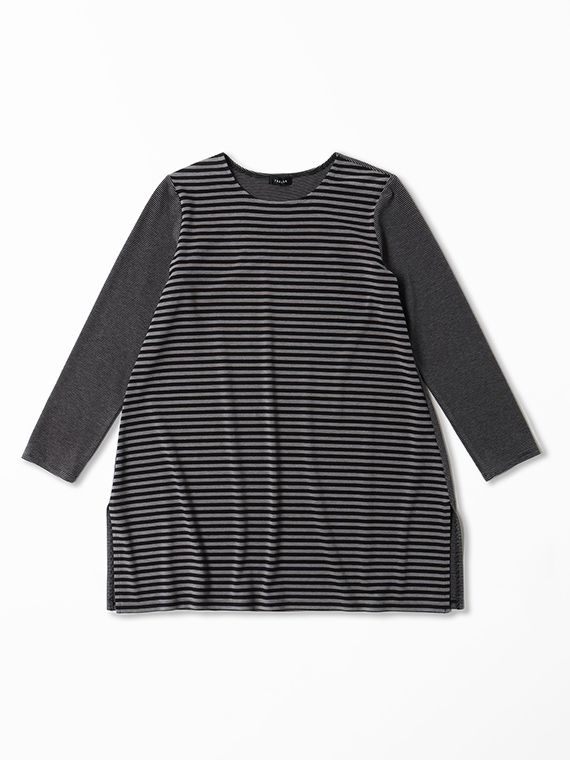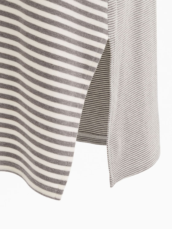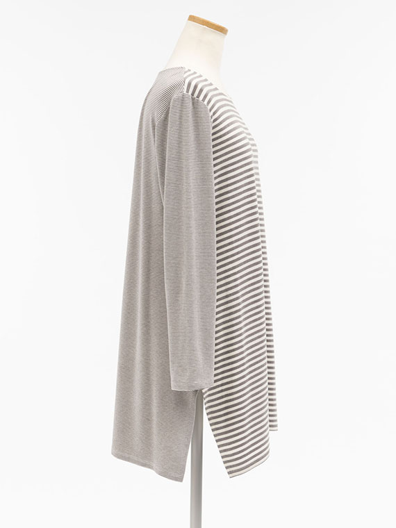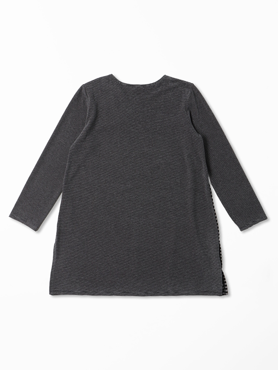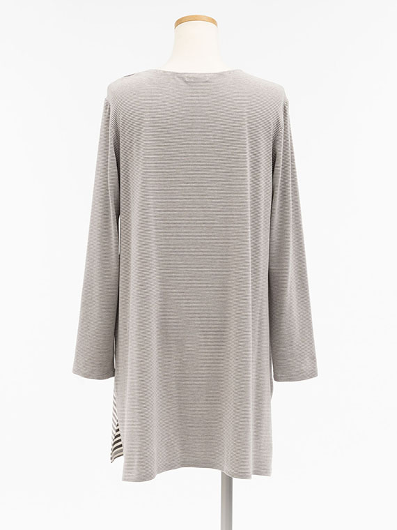 ロング丈ですので、パンツとのバランスも取りやすく、裾の両脇に入ったスリットが歩くたびに軽やかな動きをプラスして、単なる部屋着として終わらせない、計算されたデザインです。