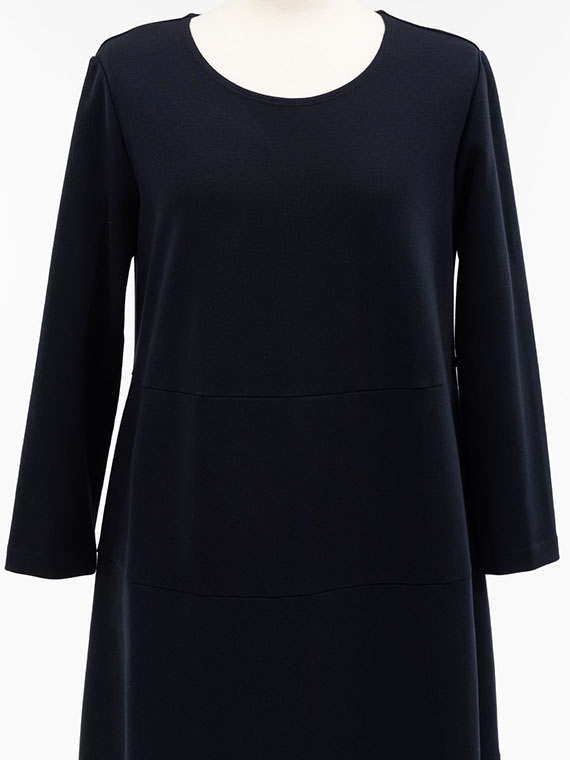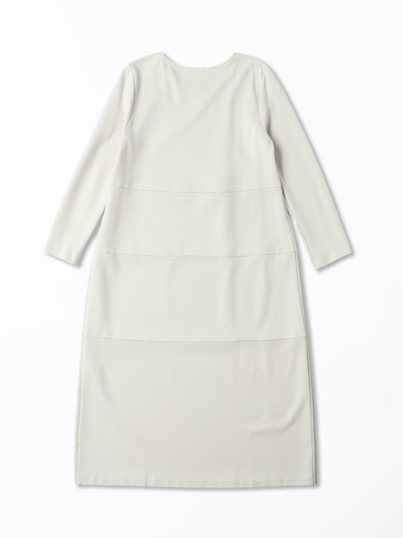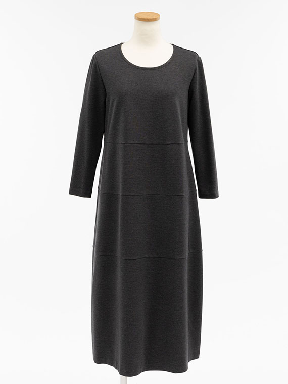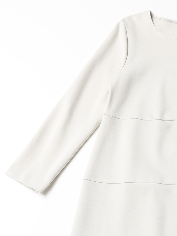 最初の切り替えをウエストよりも高い位置に入れることで、スタイルアップ効果を狙い、その下の三段の切り替えをあアクセントとして、裾に向かってAラインとコクーンラインの中間のような優美なシルエットで仕上げました。