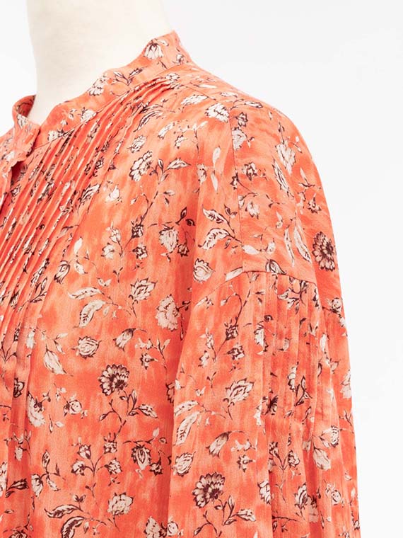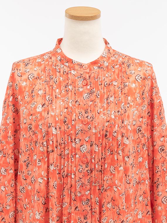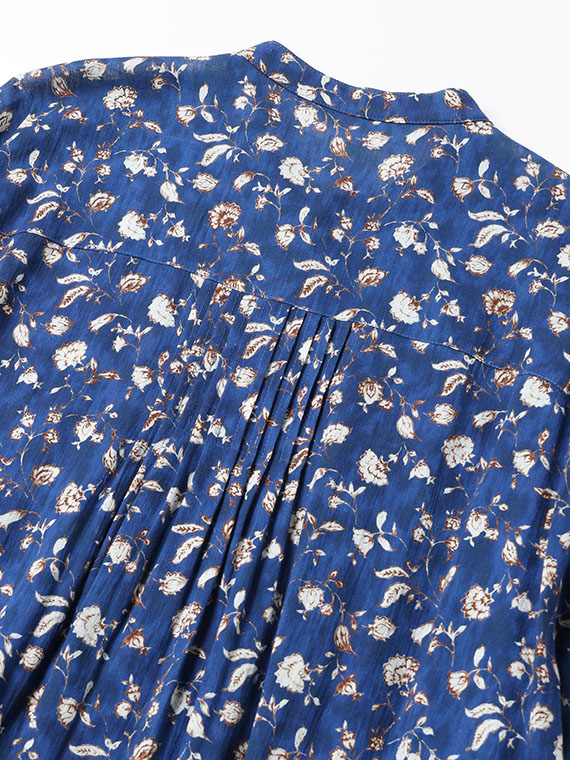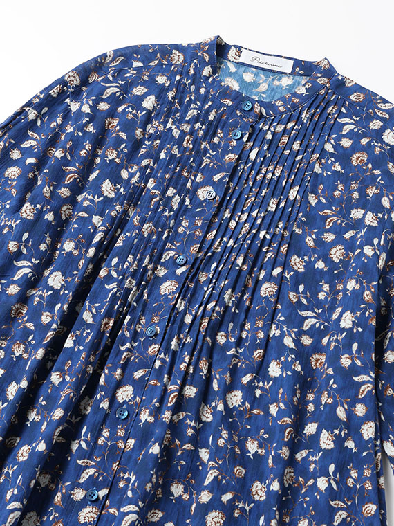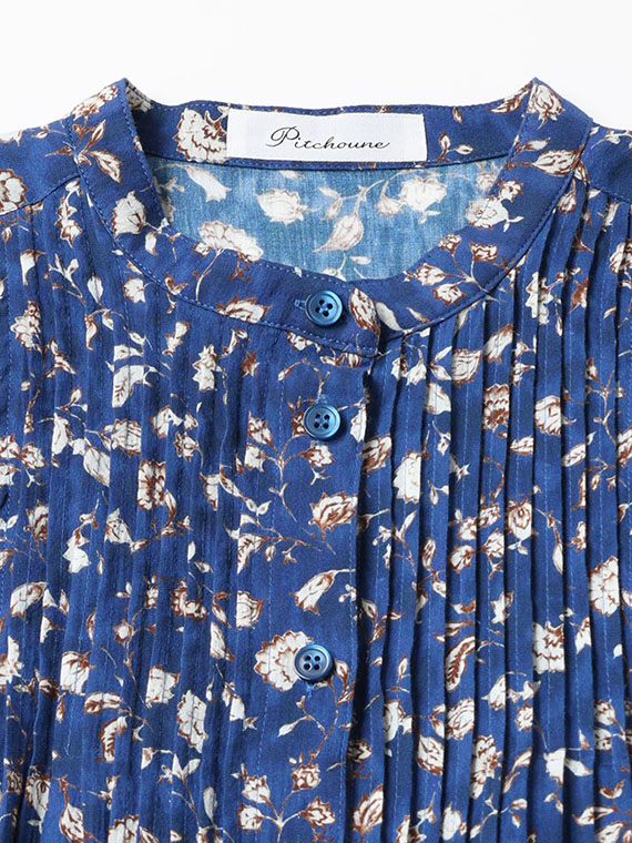 前の首元、後ろのヨーク下、そして袖付け部分にも細やかなピンタックが施されており、この繊細なディテールが、大人の可愛らしさ、いわゆる「ガーリー」なニュアンスをプラスしています。