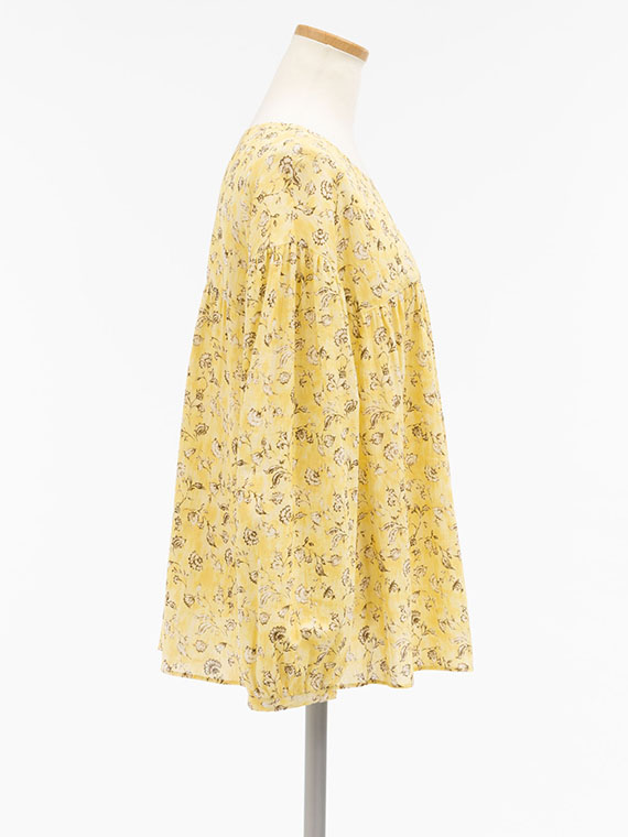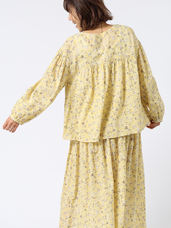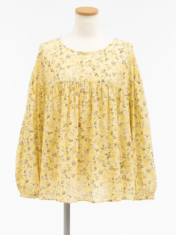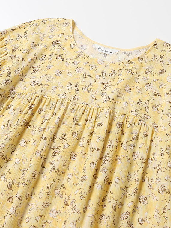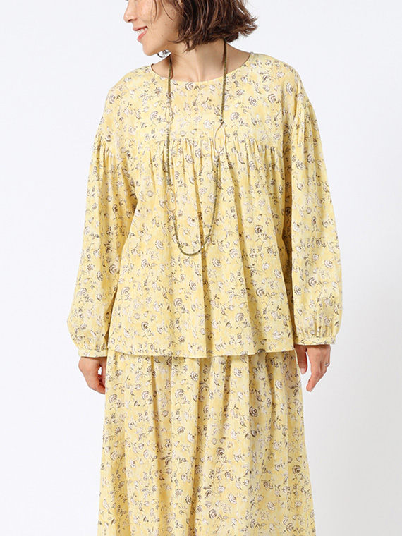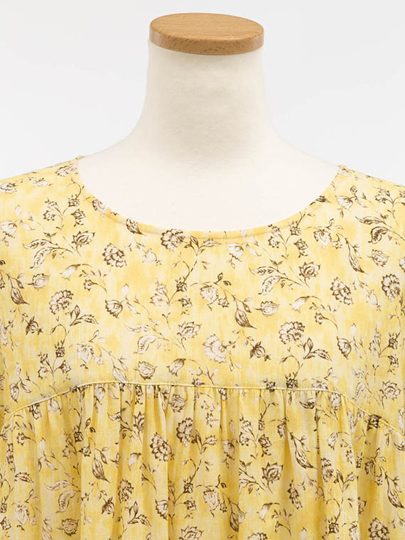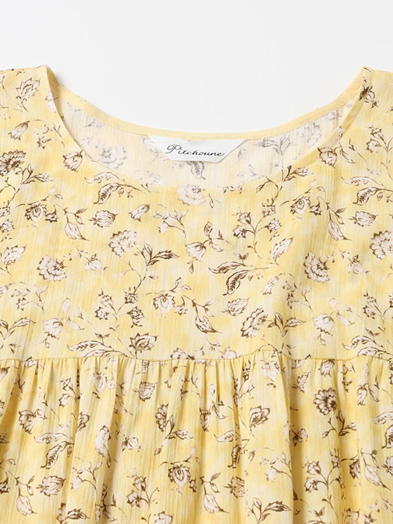 前後とも胸の上で切り替えるヨークが入ったデザインで、この切替部分から下にたっぷりとギャザーを施すことで、身頃にゆとりと優雅なドレープを生み出し、着る人の体をふんわりと包み込みます。