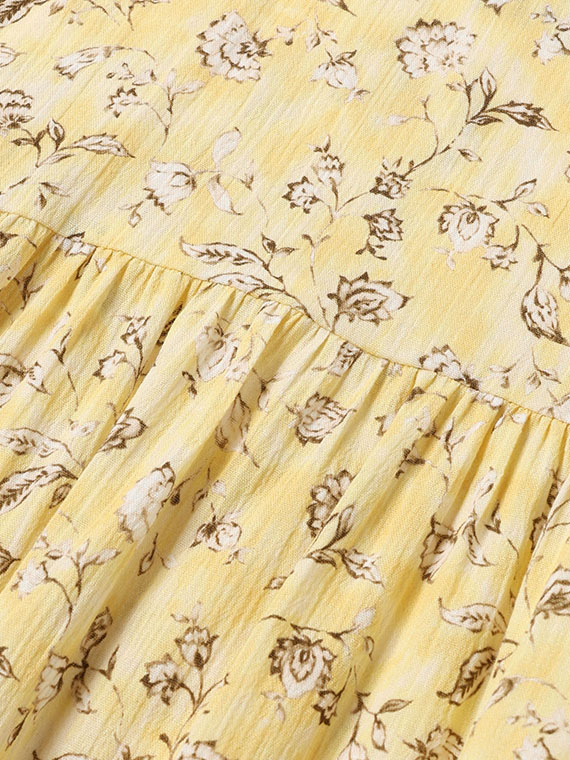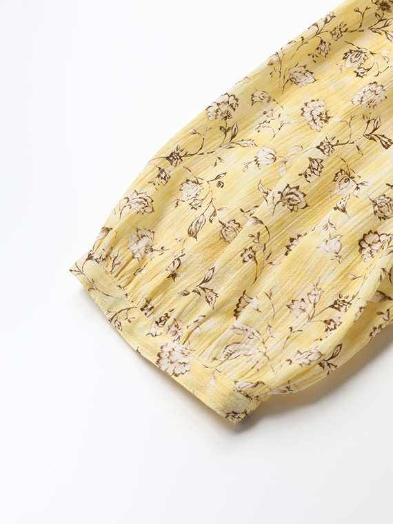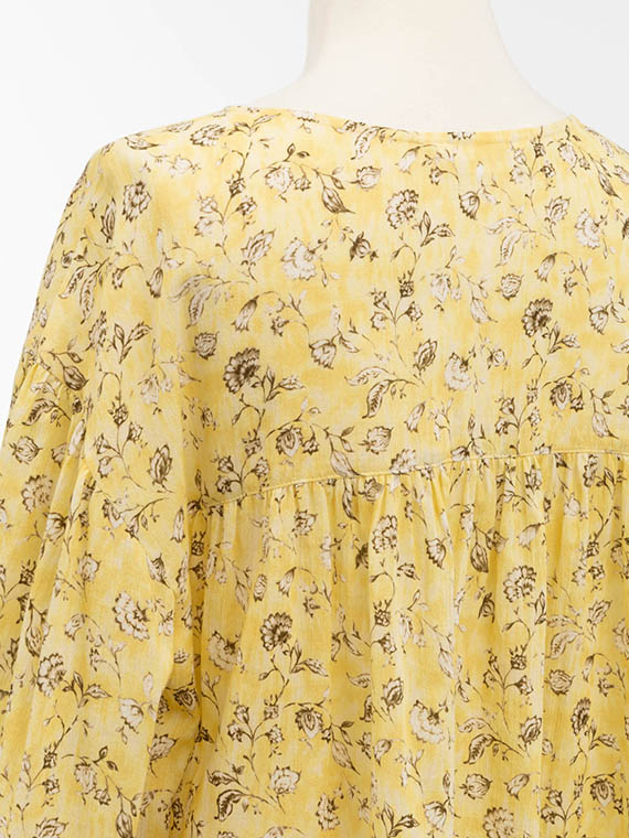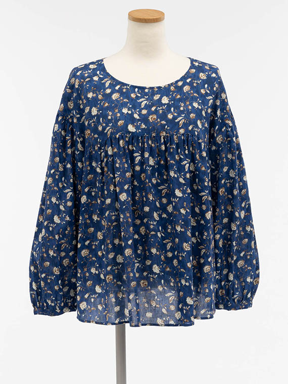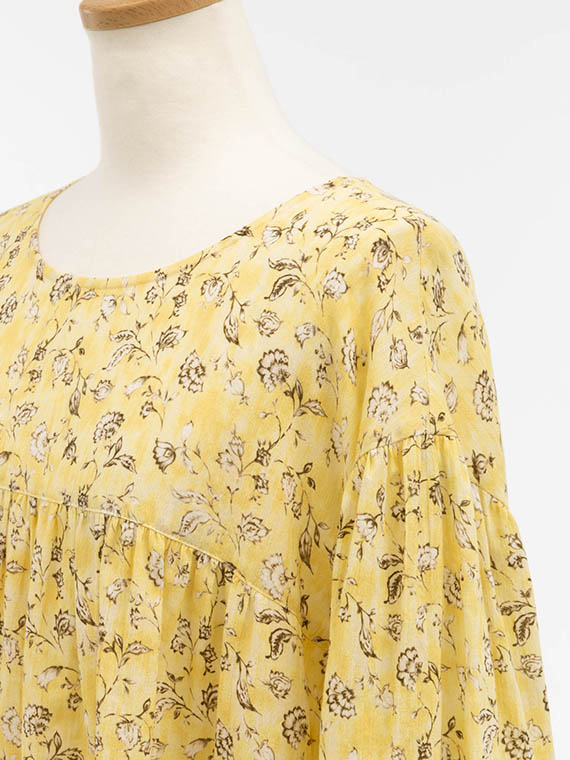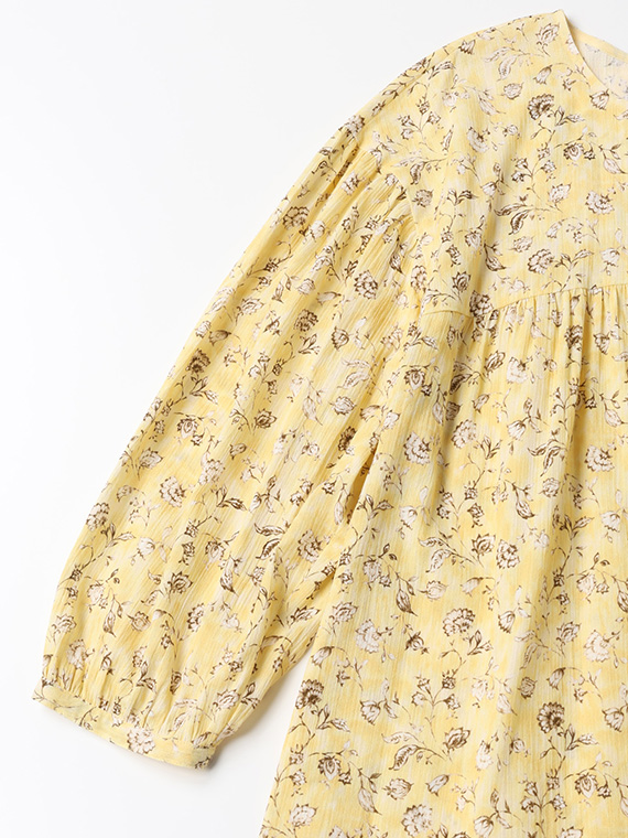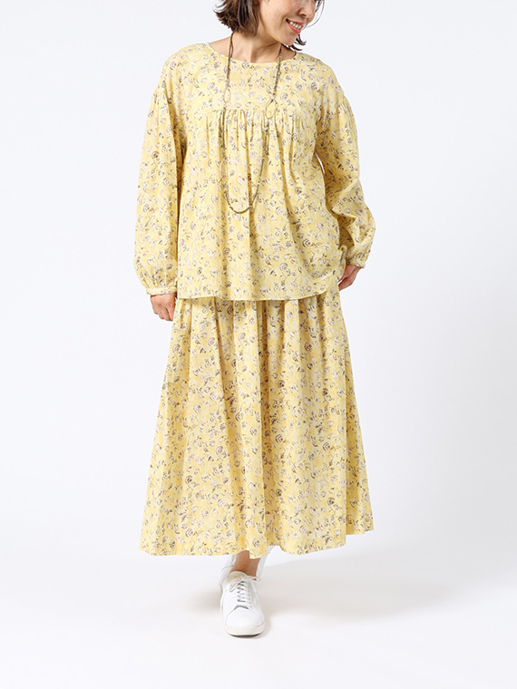 前後とも胸の上で切り替えるヨークが入ったデザインで、この切替部分から下にたっぷりとギャザーを施すことで、身頃にゆとりと優雅なドレープを生み出し、着る人の体をふんわりと包み込みます。