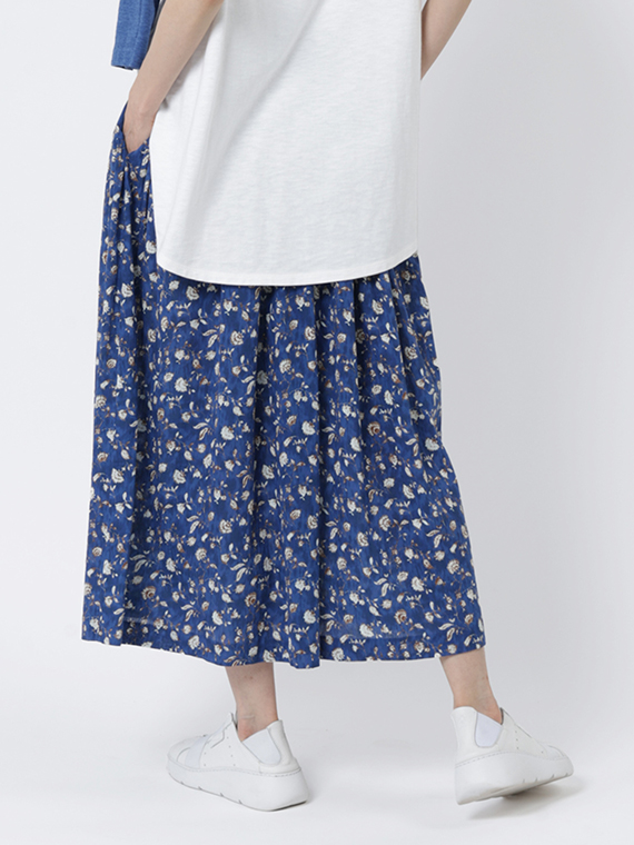 ウエストは楽なゴム仕様ですが、トップスをインしても美しく見えるよう、ギャザーの寄せ方や始末にこだわりました。