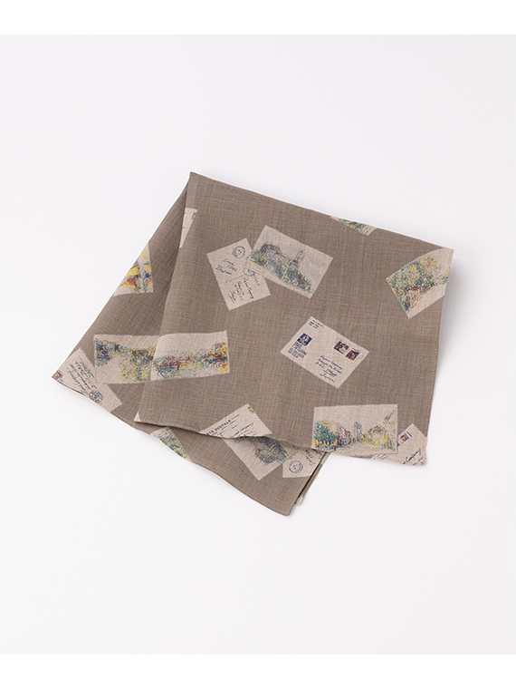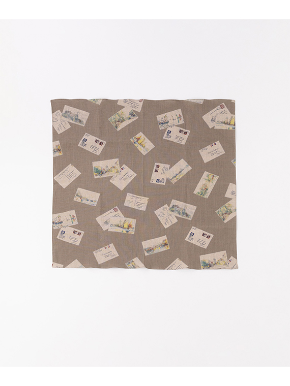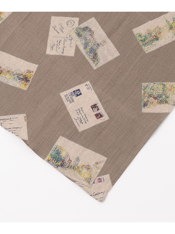 下生地は、リネンの原料の中で最高ランクであるベルギー近辺の大変貴重な原料を使用したリネン本来の清涼感、高級感のある素材です。フランスの南と北東地域の海岸リゾート地や小さな村の1920年代〜30年代の風景を参考にアレンジして繊細な水彩タッチで絵葉書を描きました。