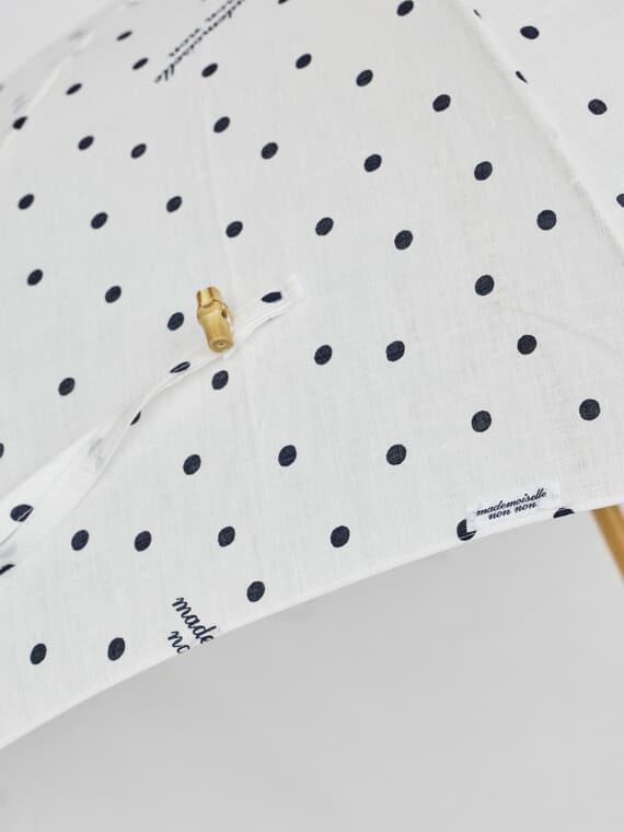 下生地は、リネンの原料の中で最高ランクであるベルギー近辺の大変貴重な原料を使用したリネン本来の清涼感、高級感のある素材です。1950年代から60年代をイメージした水玉をシンプルに正円をフリータッチで描き、バランス良く描きました。『mademoiselle nonnon』のロゴをポイントに入れたクラシックで洗練された水玉柄です。こちらは手捺染プリントです。