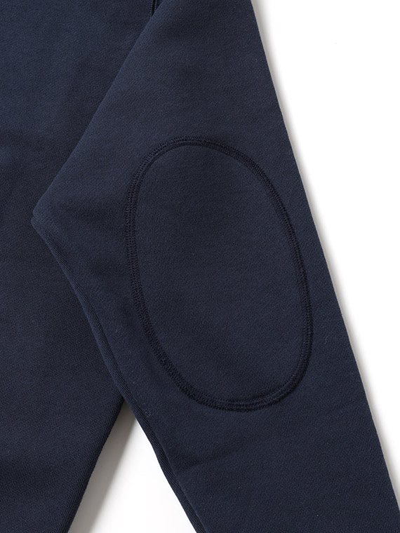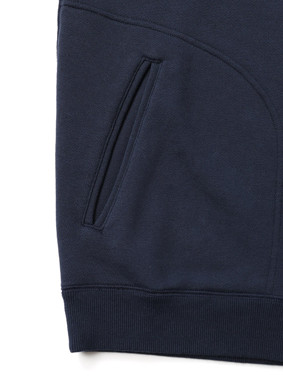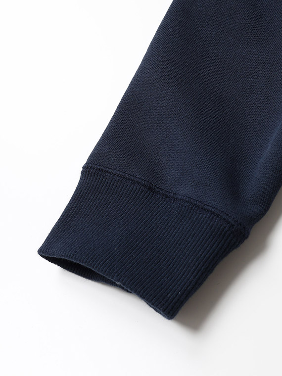 生地は、表糸に綿、裏糸にポリエステルを使用した裏毛素材です。カジュアルな風合いですが裏をポリエステルにすることにより、吸水速乾性に優れた軽い着心地が特徴です。型崩れしにくく、カジュアルからスポーツまで様々な分野で活躍する一着です。