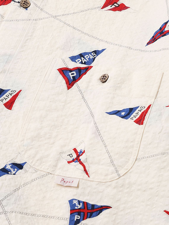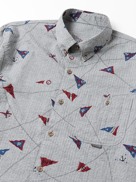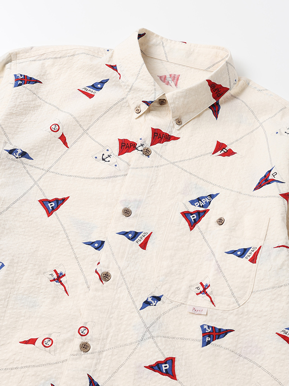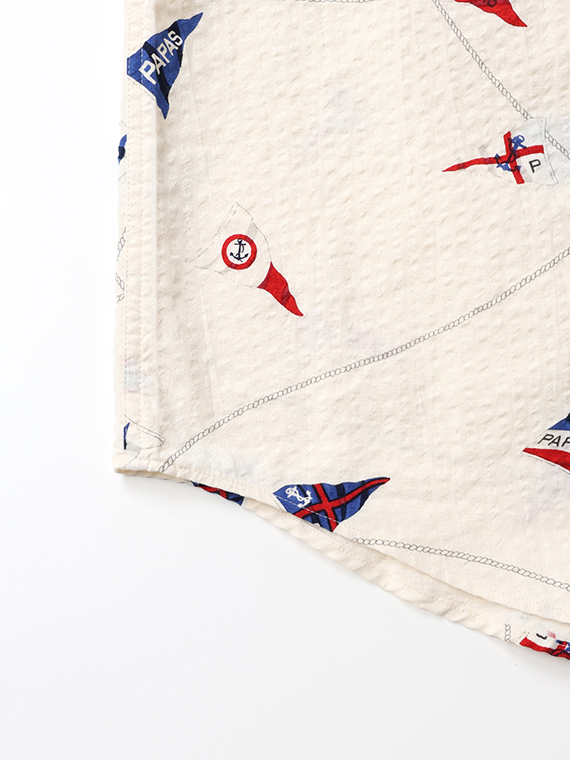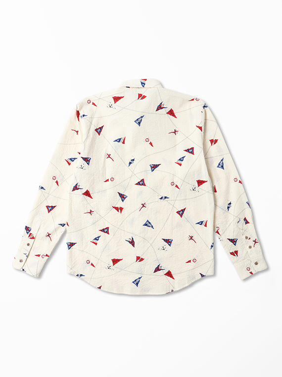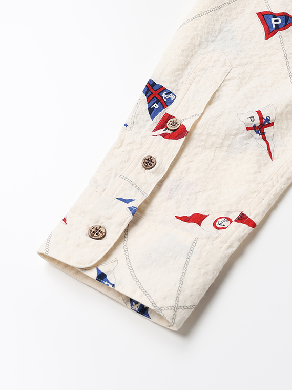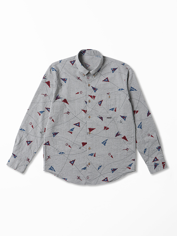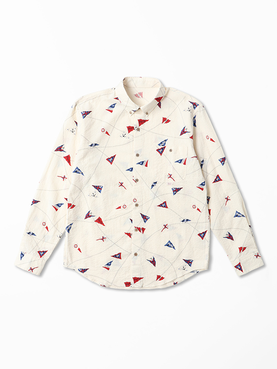 コットンサッカープリント マリン柄 ボタンダウン長袖シャツ