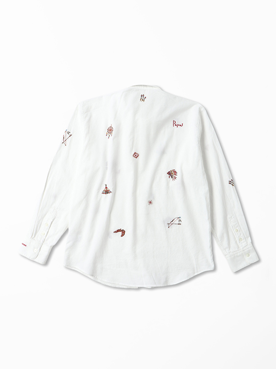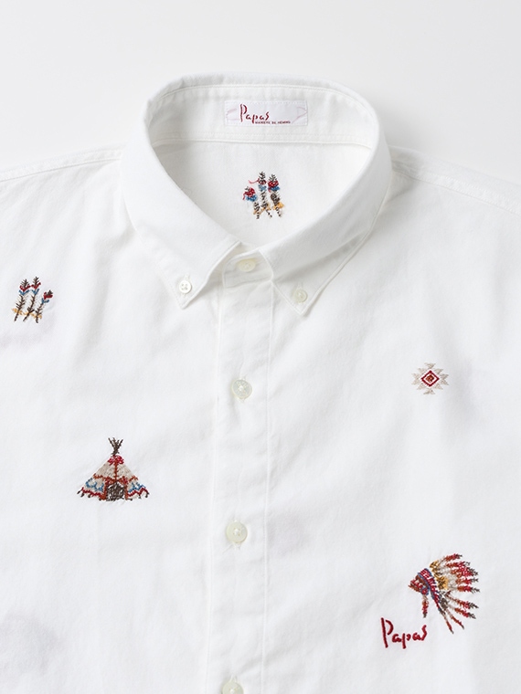 生地全体には、インディアンモチーフを飛び柄刺繍で散りばめました。カジュアルながらも上品さを失わないデザインで、一枚着としてはもちろん、ニットやアウターのインナーとしても活躍します。大人の休日スタイルにおすすめの一枚です。