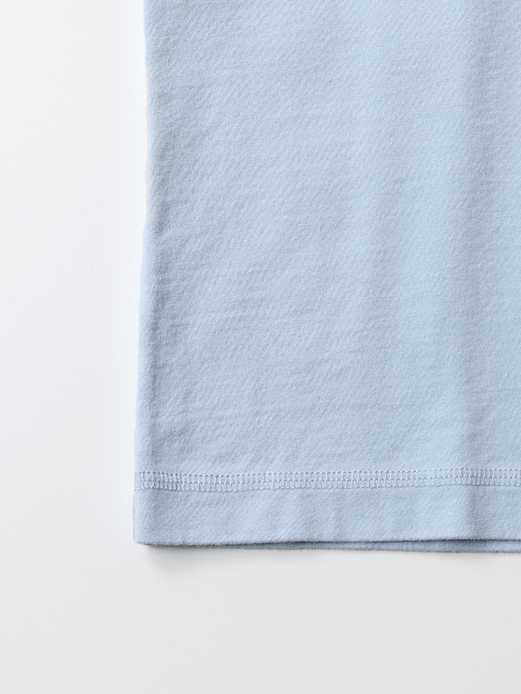 定番の40/2天竺にはコーマ糸を使用しています。糸はコーマ工程を通すことで、糸が滑らかで毛羽立ちの少ない糸になります。コーマ工程では、毛羽の素になる短い繊維を15%程取り除くので、糸はキレイで丈夫になるのです。そのコーマ糸を1本ではなく2本を撚って編むことで、更に毛羽立ちが少なく斜行しない生地になります。糸は左方向に撚りが掛けられているのが一般的です。一本の糸で編むと左に捩れようとしますが、2本を撚るときに反対の右方向に撚ることで、斜行せず安定した生地になります。定番なので、品質重視、毎年安定したクオリティでお届けしています。