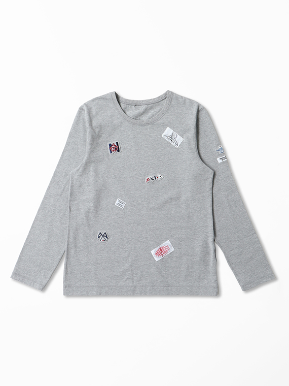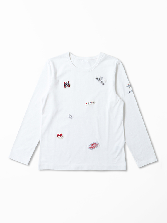 前身頃には2~3色使いの刺繍ワッペン3個とネーム2個をあしらい、左袖には3色刺繍のワッペン1個とNONNONネームを配置しました。