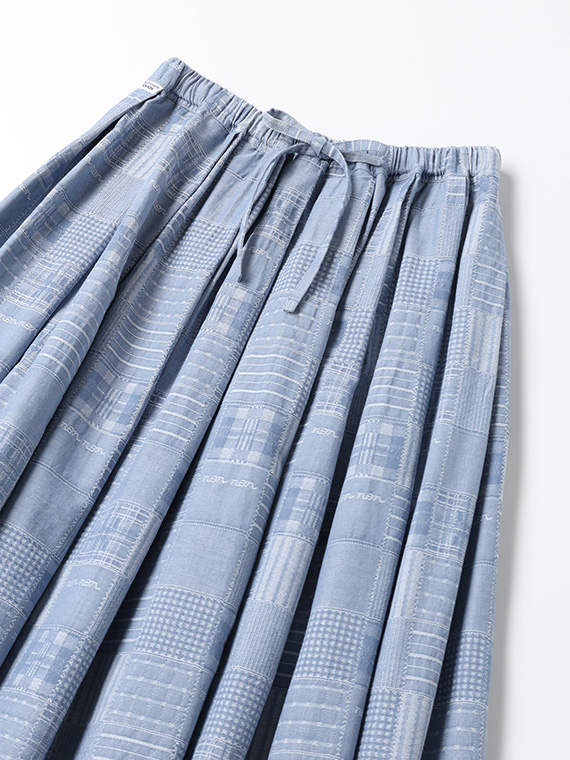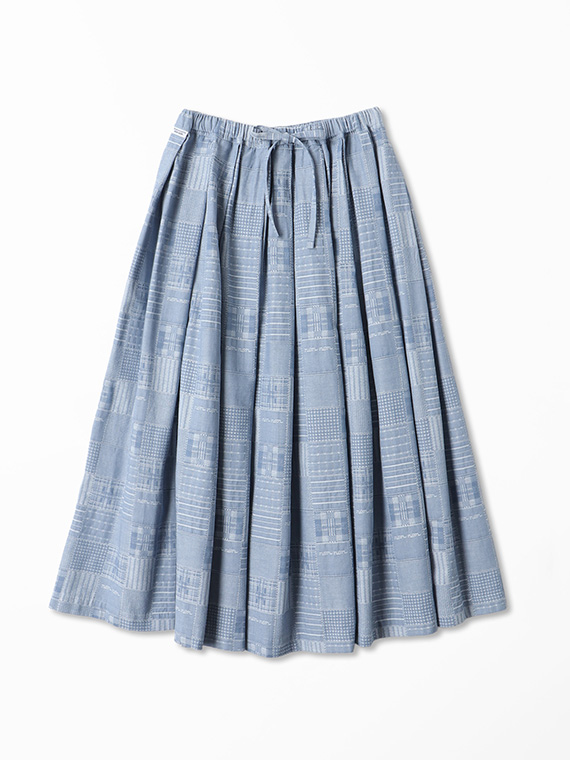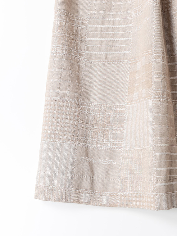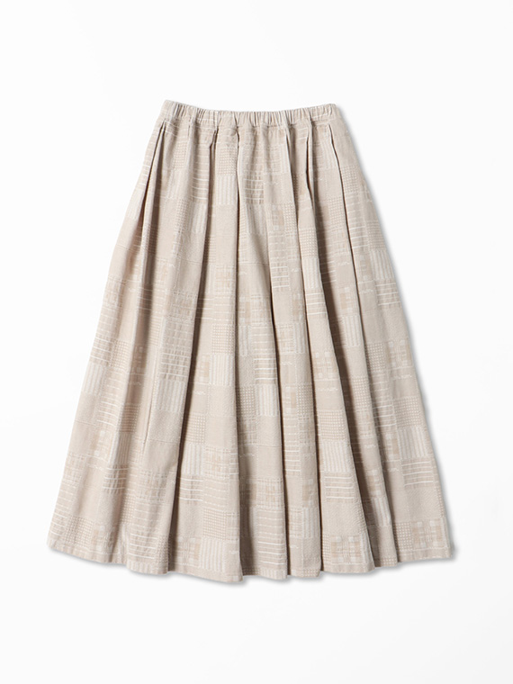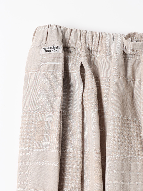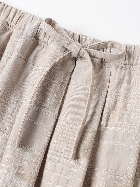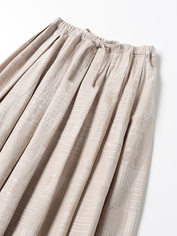 生地そのものに柄を表現しているため、プリントとは違う立体感とナチュラルな風合いが魅力です。シルエットは動くたびに表情が出る車ひだのタックデザイン。ウエストはゴム仕様で、ラクな履き心地ながらも、きちんと見えるバランスに仕上げています。
