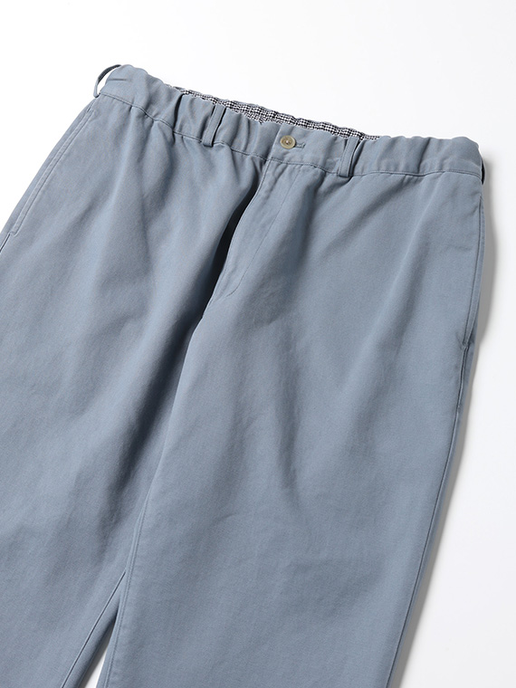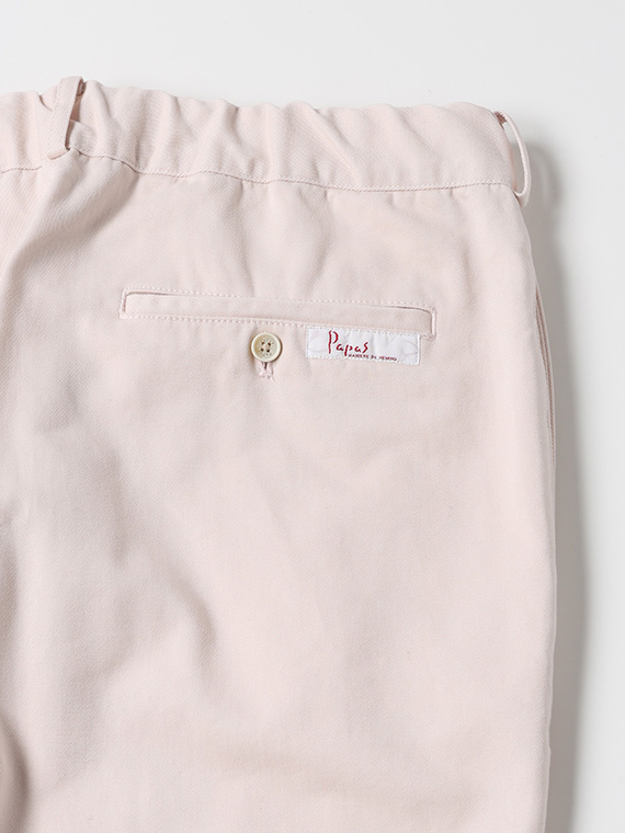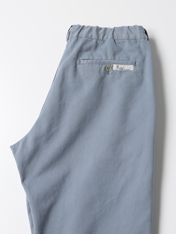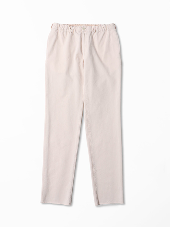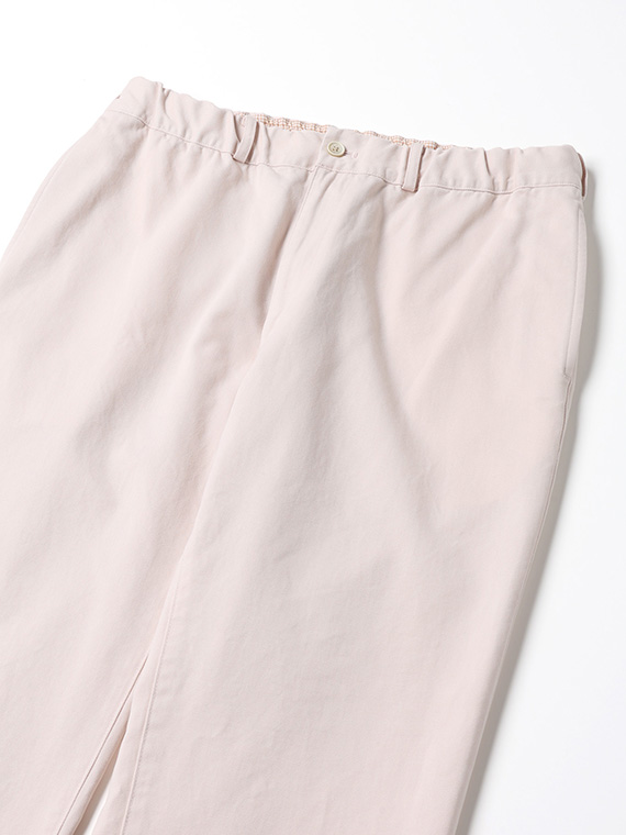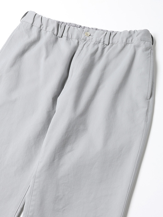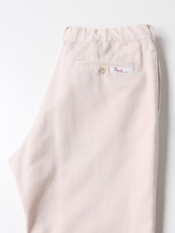 タテに20/1ヨコに10/1のコットンカード糸を使用したチノ素材です。密度も甘めで、カード糸の持つ綿本来の素朴でナチュラルな表情を楽しめます。加工はクラボウ徳島工場の「ミルウォッシュ」を施しています。細かく密度の濃い微起毛と、減量加工を組み合わせることにより、繊細でソフトな風合いに。