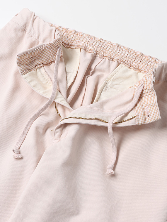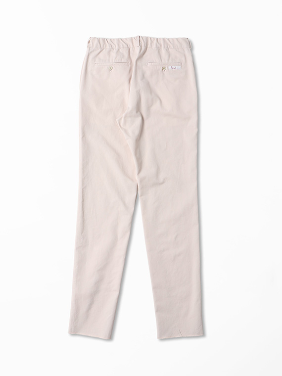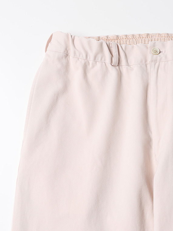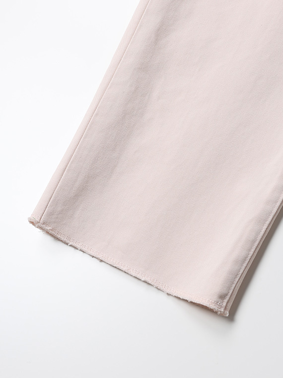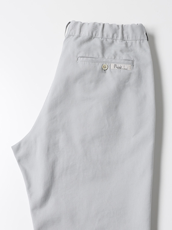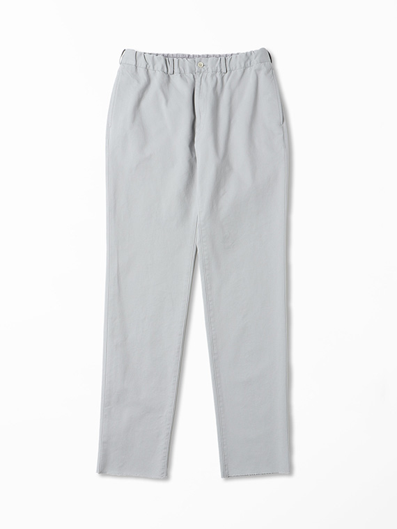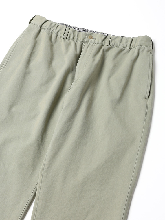 タテに20/1ヨコに10/1のコットンカード糸を使用したチノ素材です。密度も甘めで、カード糸の持つ綿本来の素朴でナチュラルな表情を楽しめます。加工はクラボウ徳島工場の「ミルウォッシュ」を施しています。細かく密度の濃い微起毛と、減量加工を組み合わせることにより、繊細でソフトな風合いに。