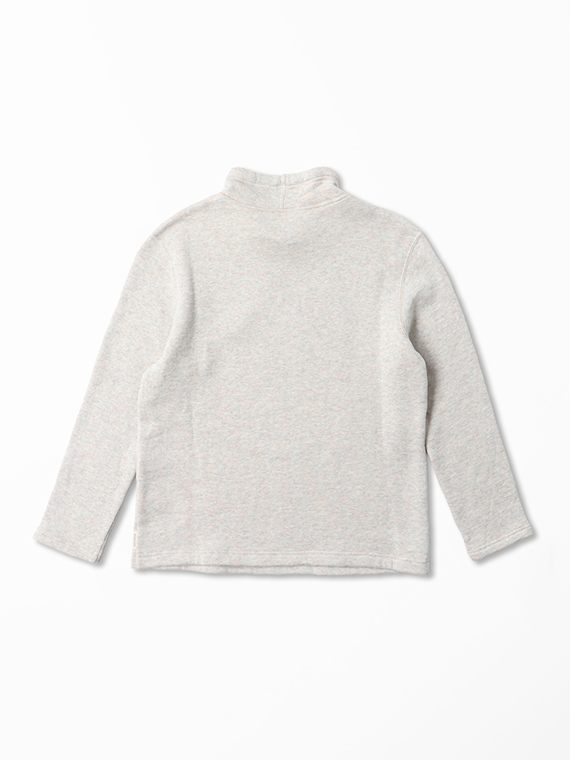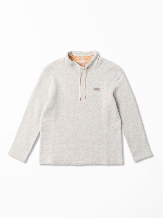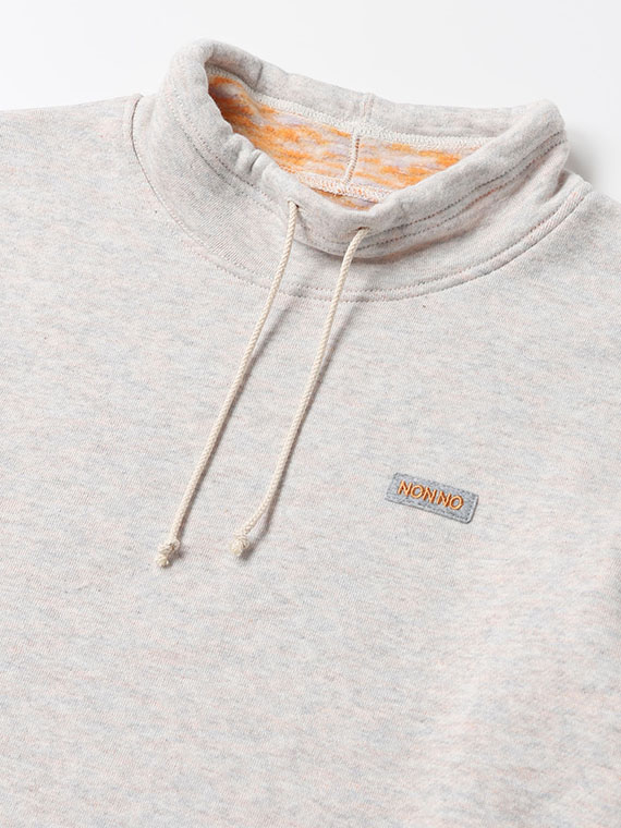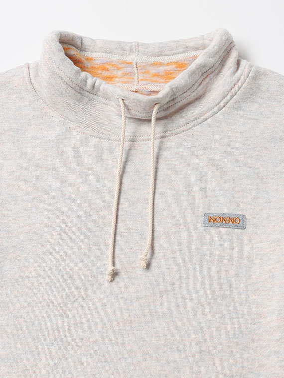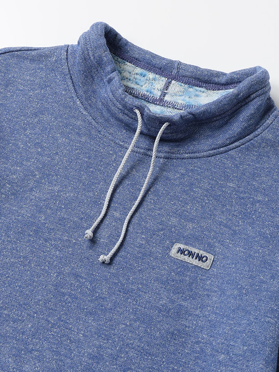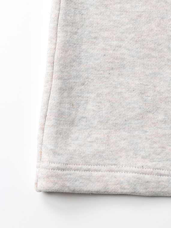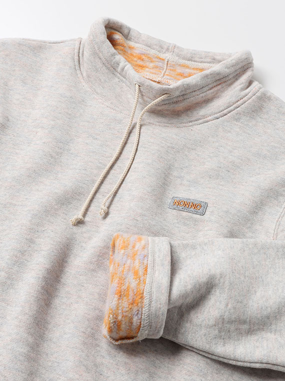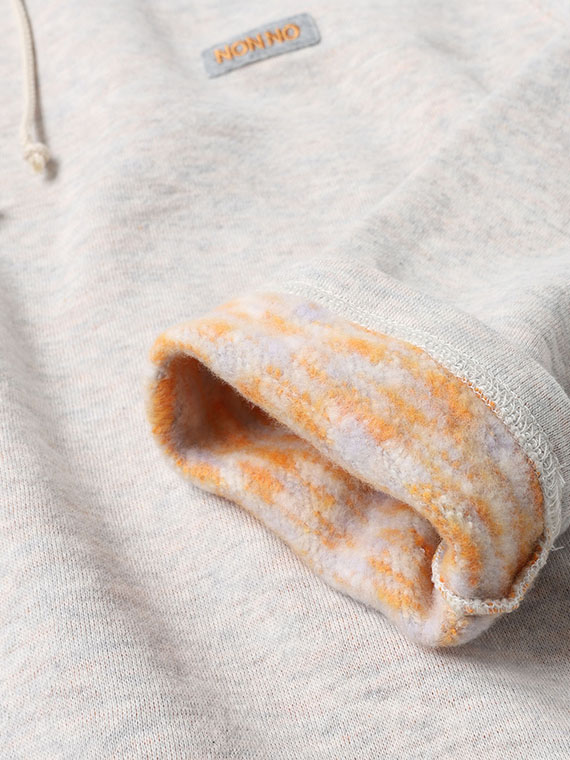 今年の素材は例年に比べ1番手薄く仕上げたため、軽く仕上がっています。ループサイド(裏面)には凸凹のあるスラブ糸を独特な染色方法である絣染で多色使いしています。マーブル調が特徴の裏毛です。起毛の深さにも拘り絶妙に調整されています。編み機は通常の裏毛機ではなく吊り風の編み機を使用することで、風合いもソフトな仕上がりです。