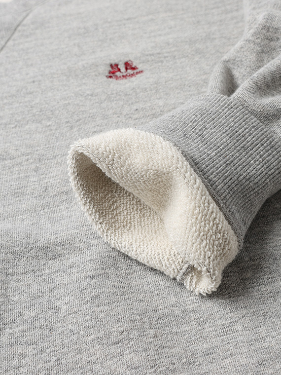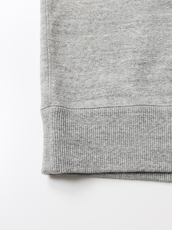 生地は、現代の効率の良い物作りとは対極にある「時間をかけて作る物作り」そこから生まれる「本物の着心地」を追及した「ラフィ吊り裏毛」です。この生地の最大の特徴は、希少な「吊り編み機」を使用し糸に余分な力をかけず、重力にあわせて時間をかけ編み立てることで仕上がった柔らかな風合い。また、ムラ糸の「ラフィ」を使用し、編み上がりに独特のヴィンテージ感を作り上げています。