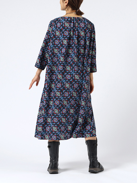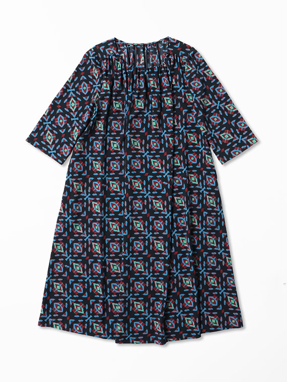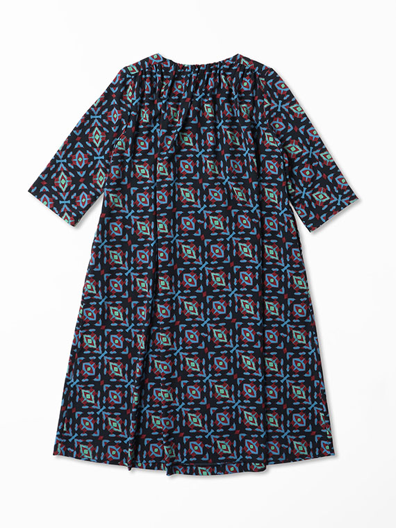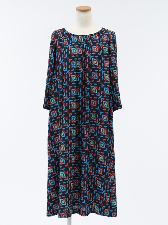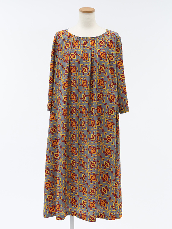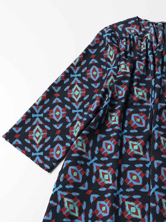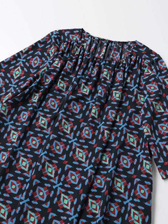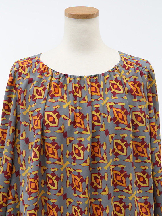 前後衿ぐりと肩ヨーク下に入れたたっぷりのギャザーが、美しい生地のドレープを最大限に引き立て、大人の女性にふさわしい余裕のあるシルエットを描き出します。