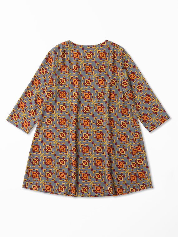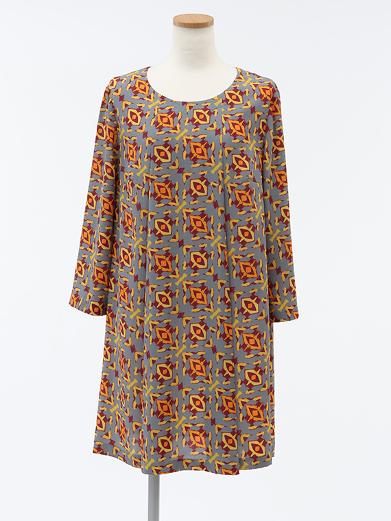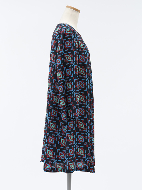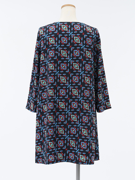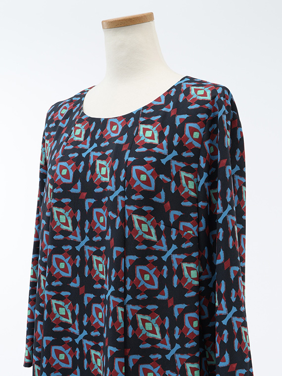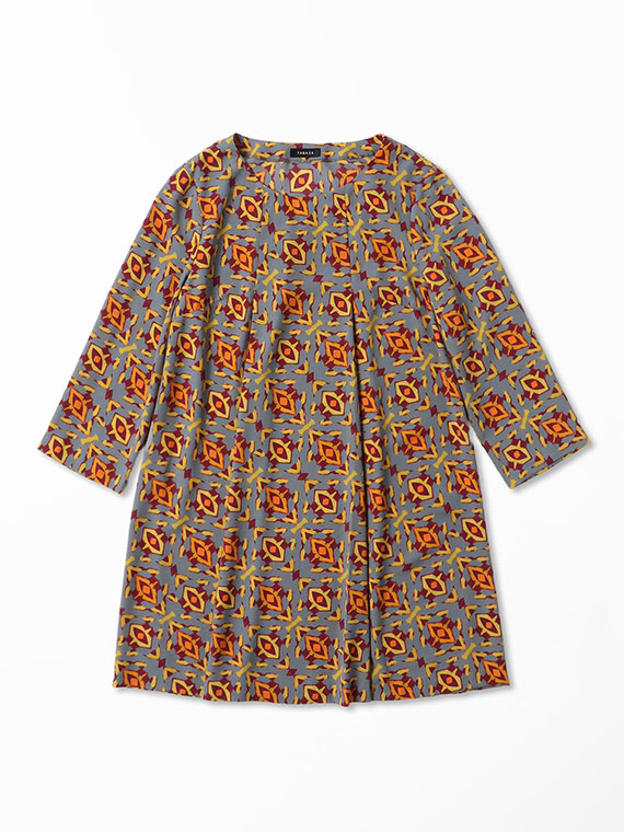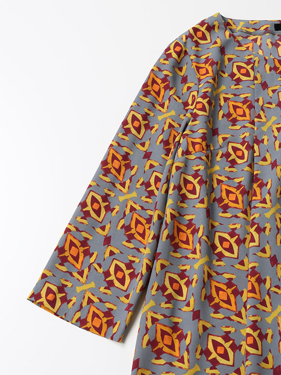 首元から流れるように入った2本のタックがタテのラインを強調し、すらりとしたスタイルへと導くAラインシルエットのチュニックです。