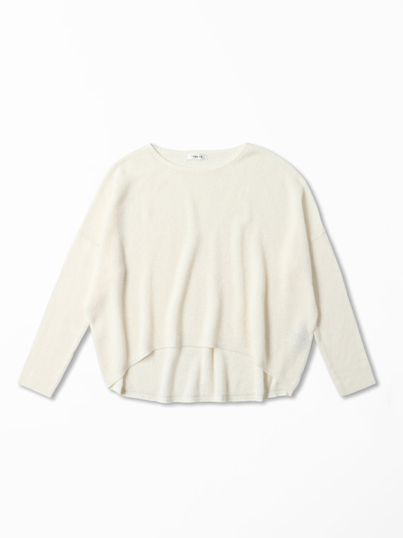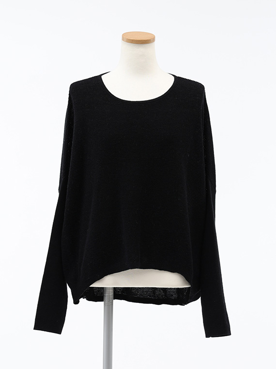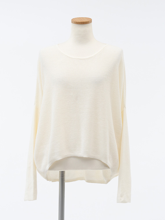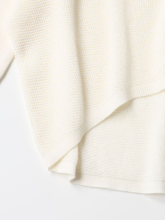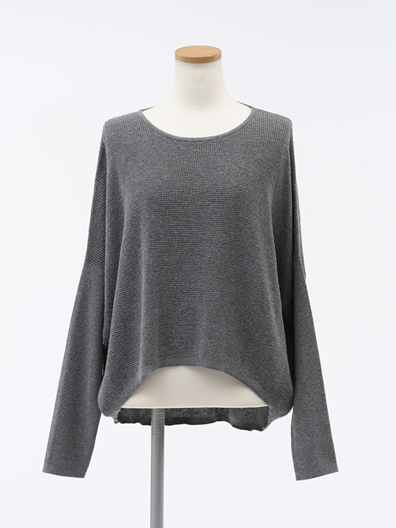 また、前後の丈が異なるイレギュラーヘムラインで、前はすっきりとウエスト丈で、ギャザースカートやワイドパンツとのバランスが取りやすく、後ろはヒップを優しくカバーする長さで、安心感があります。