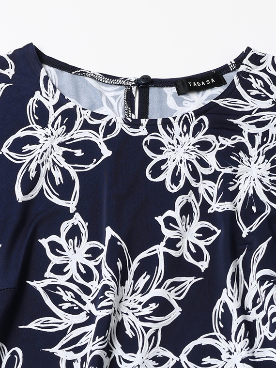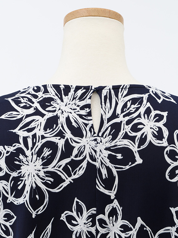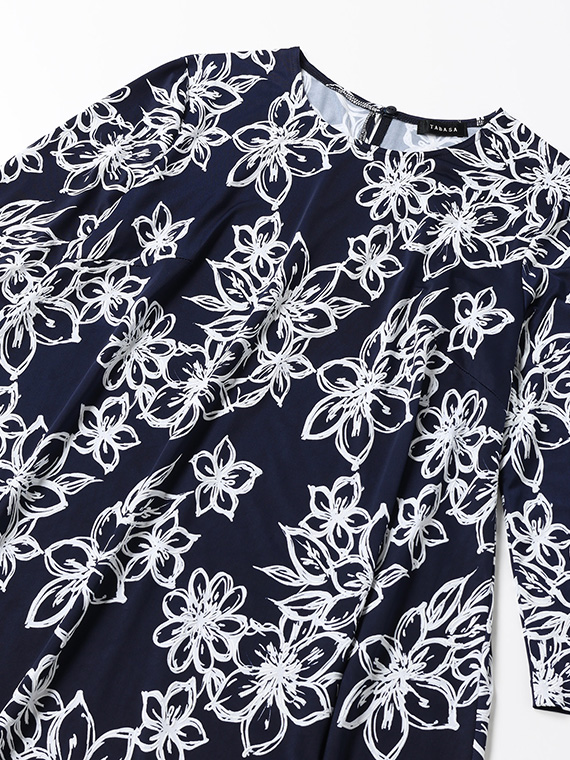 適度な重みのある生地が作り出すきれいなドレープは、動くたびにしなやかに揺れ、洗練された雰囲気を引き立て、八分袖からのぞく手首や、後ろの涙開きが、さりげない女性らしさをプラスします。