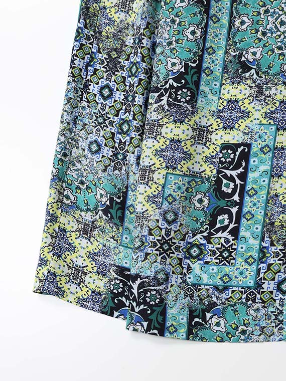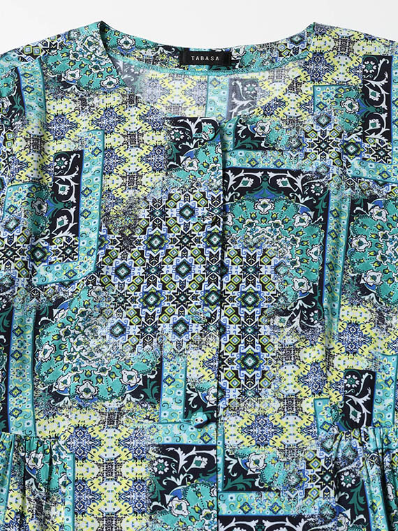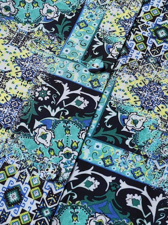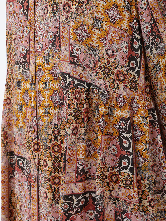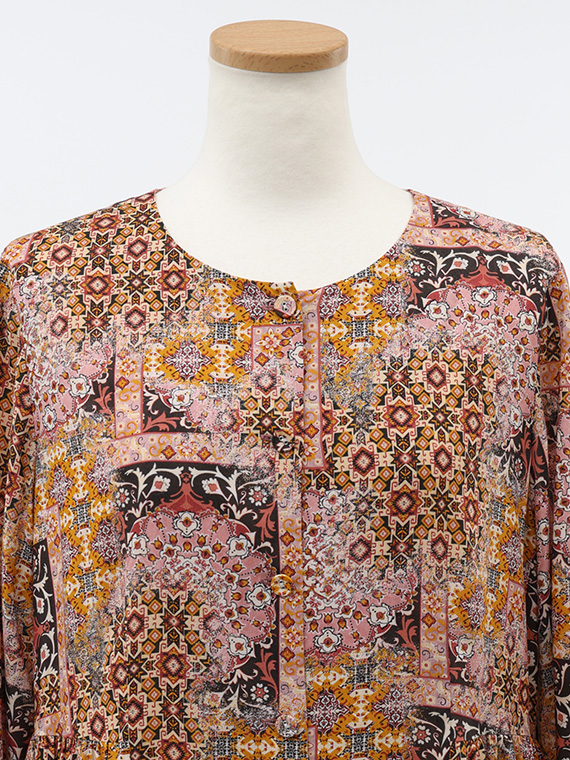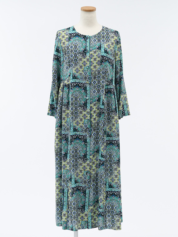 宮殿の壁画を思わせるような、優雅なアラベスク模様が目を惹く前開きのワンピースです。