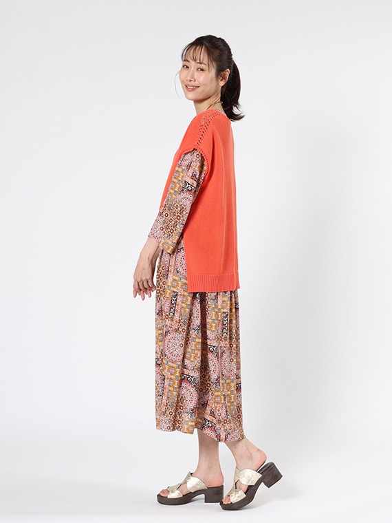 前開きタイプですので、デニムなどカジュアルパンツの上にさらりと羽織って、軽快なコート風に着こなすのも素敵です。