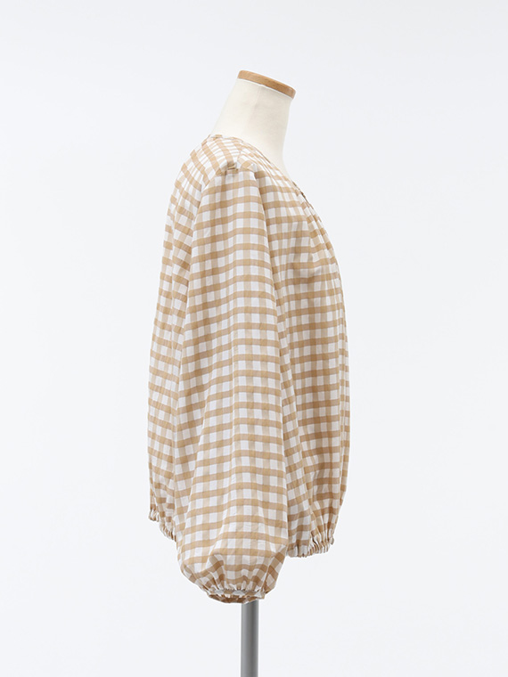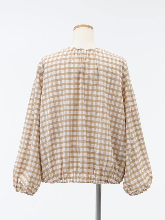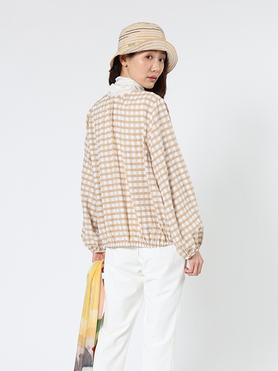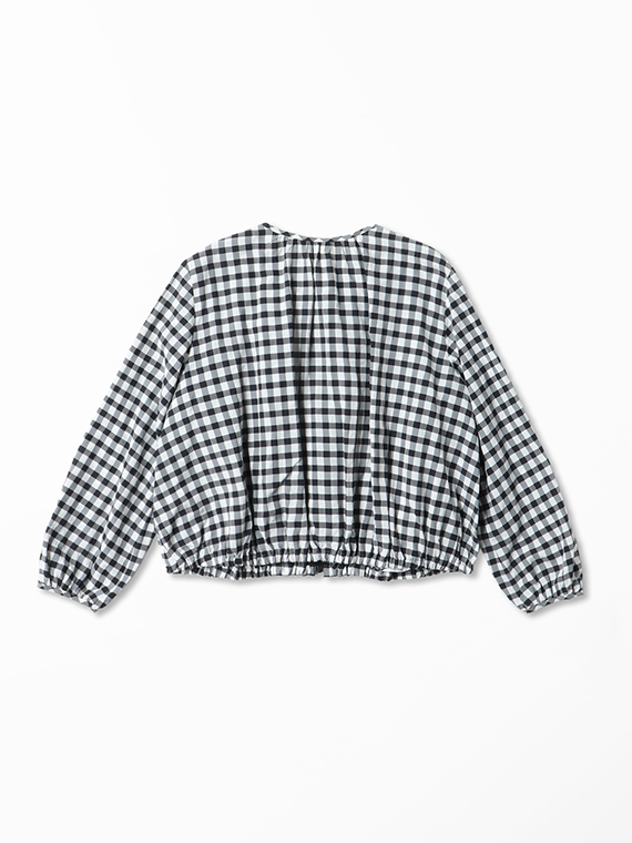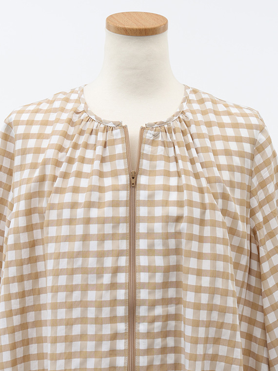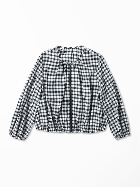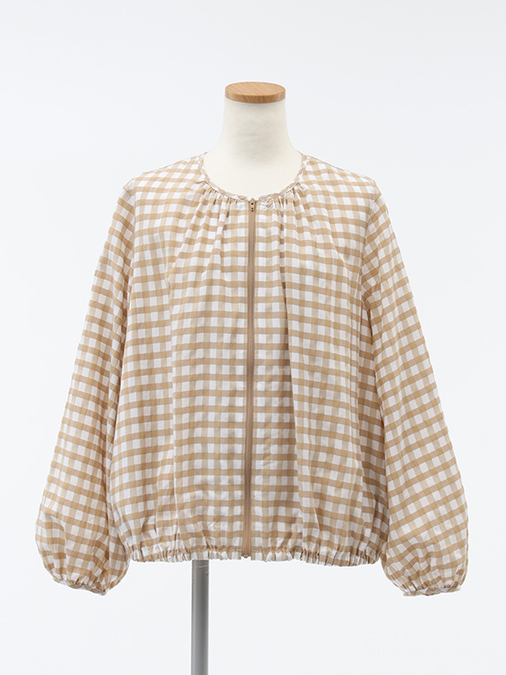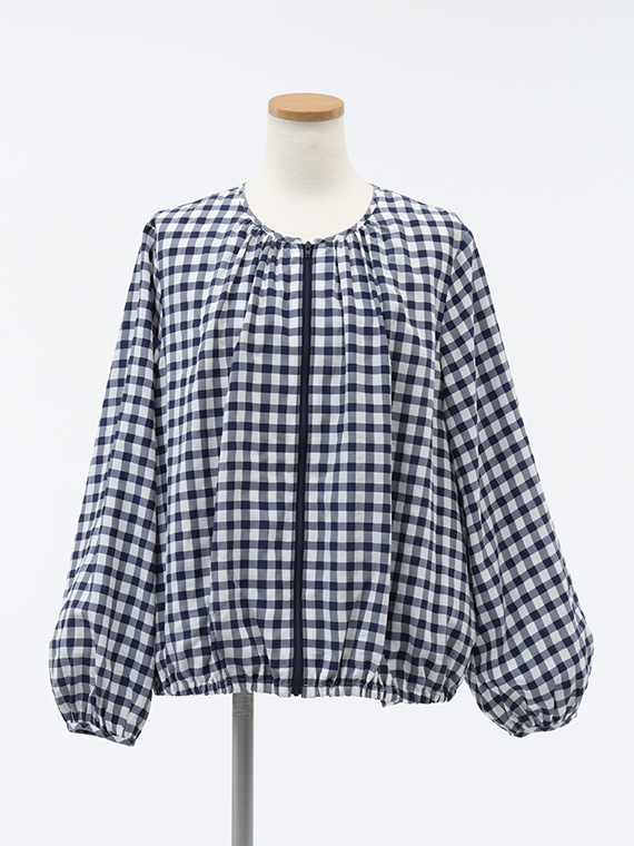 このブルゾンは、襟ぐりや裾、袖口にたっぷりとギャザーを寄せた、ふんわりと丸みのあるシルエットが特徴です。