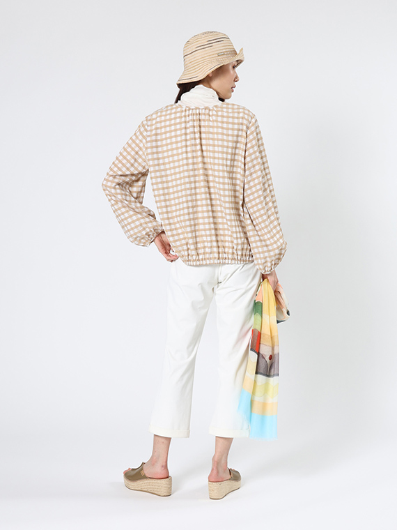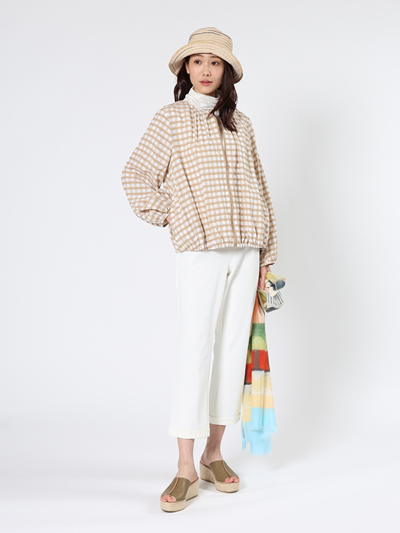 ノーカラーの首元はお顔周りを優しく、すっきりと見せてくれますし、お気に入りのスカーフやアクセサリーとの相性も抜群。