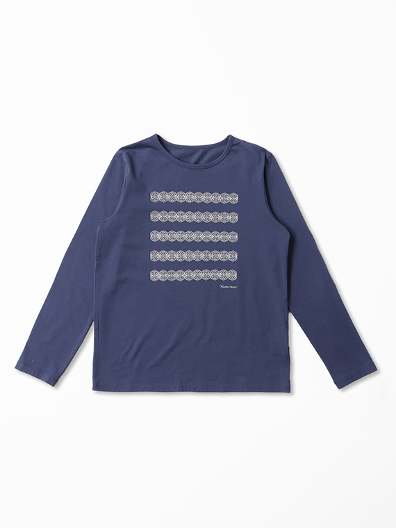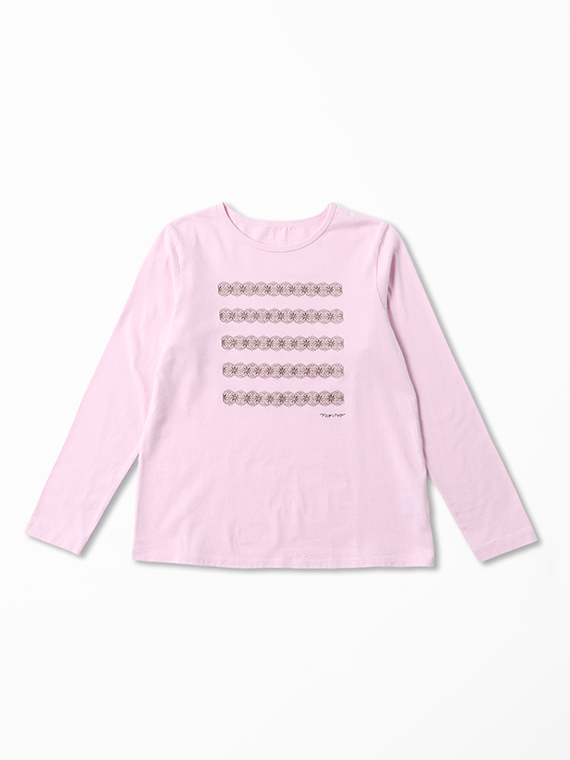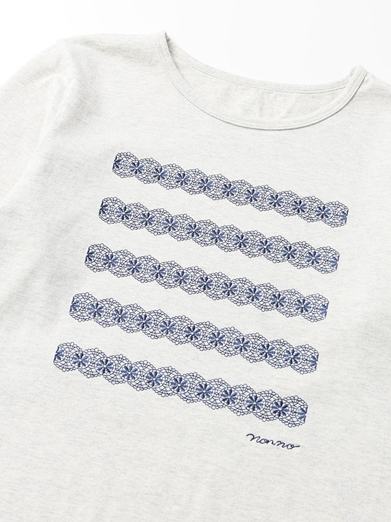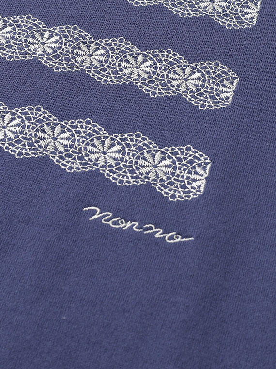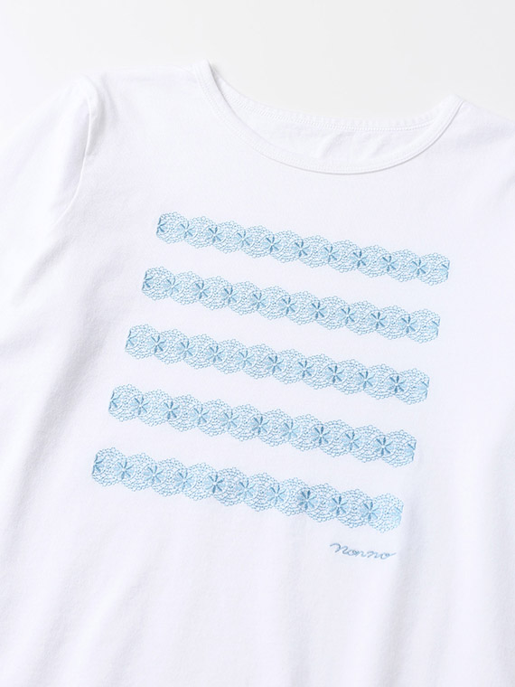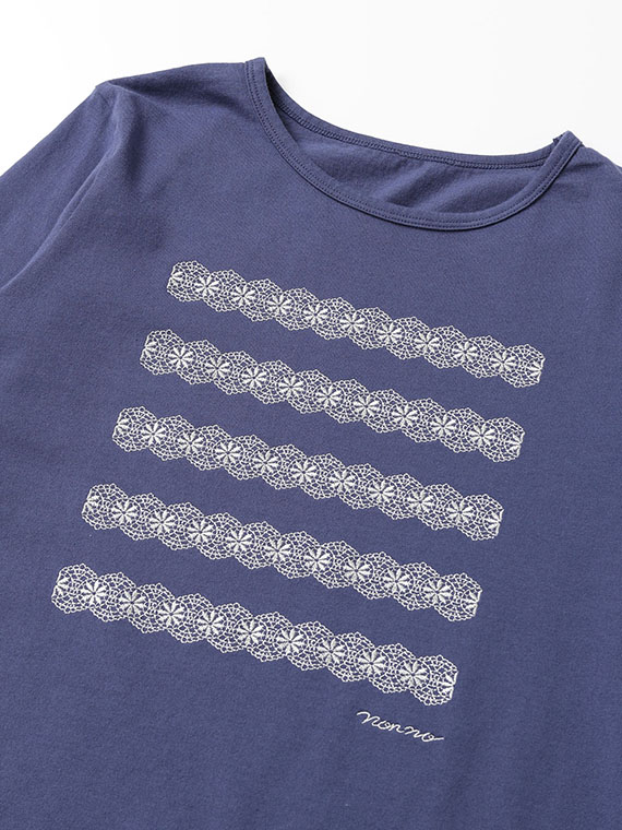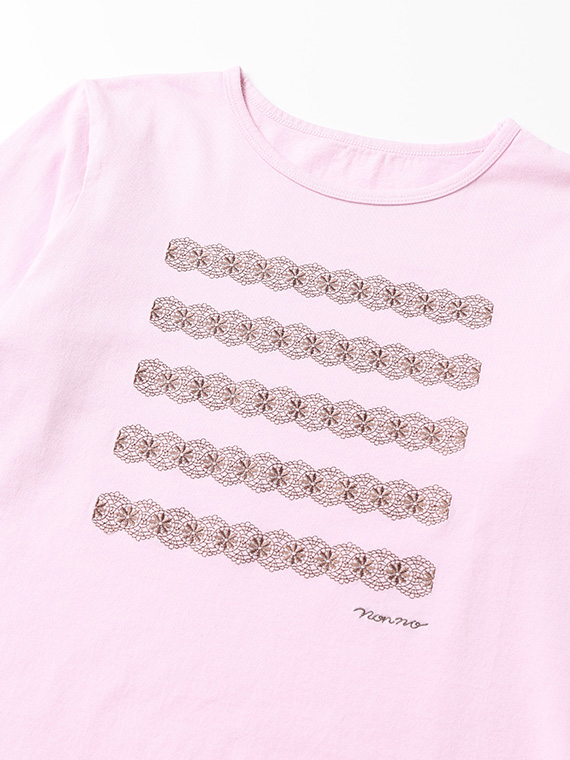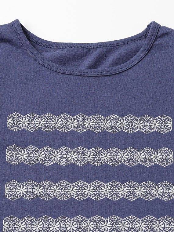 前身頃には、レース刺繍で表現したボーダー柄にロゴ刺繍をプラスし、カジュアルな中にもやさしく上品なアクセントをプラス。
