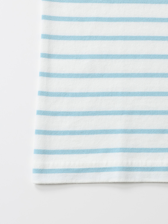 オリジナルピッチの20/2カード糸を使用した2色ボーダーです。希少な14ゲージの切替機を使用しています。ややしっかりとした生地感にキックバックを出すように度目も調整しました。着込む毎にやわらかく身体に馴染み、愛着が湧いてくる生地です。