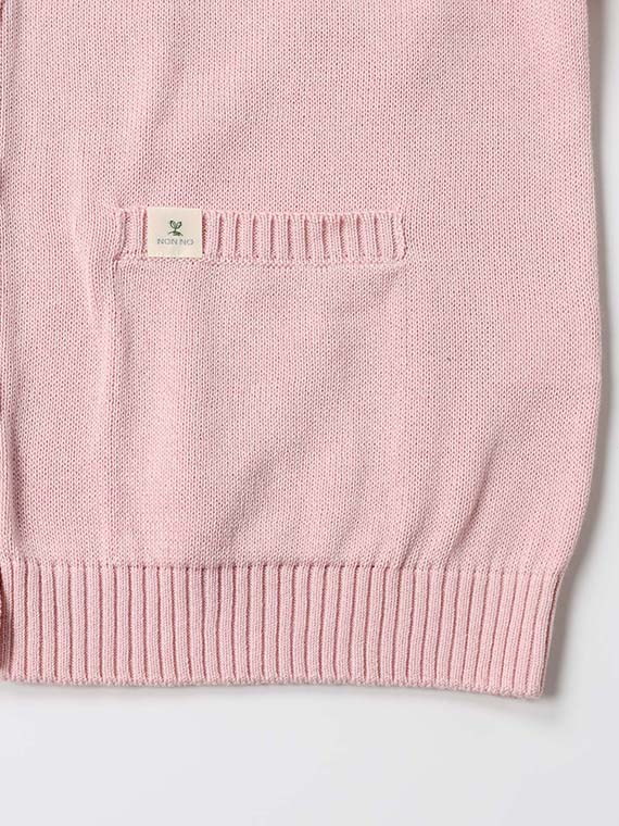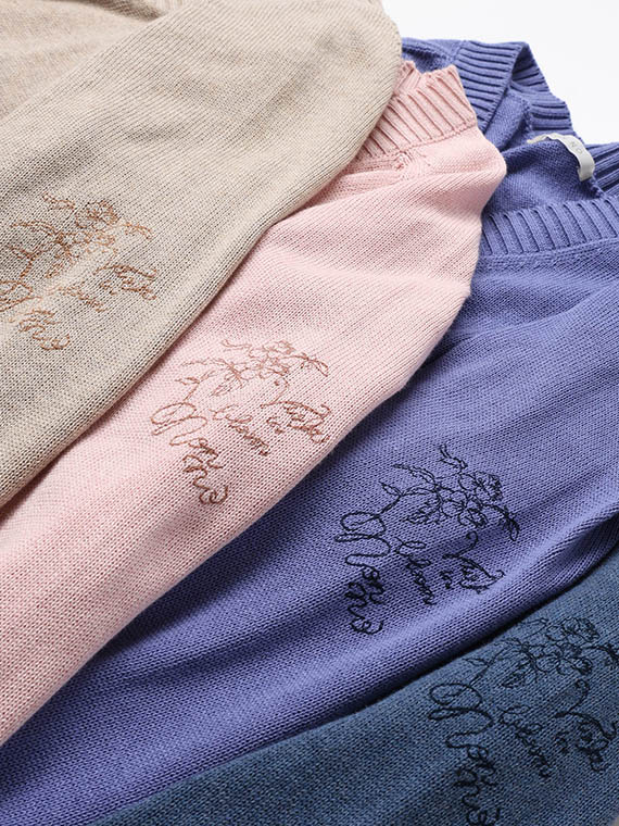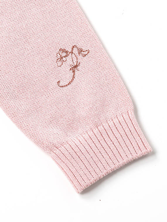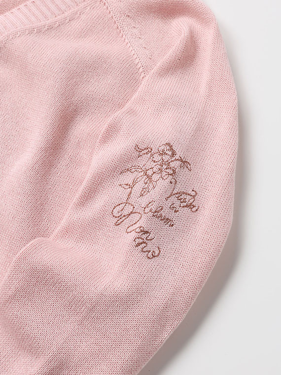 オーガニックコットンを使用した12Gニットに、刺繍入りタックスカートとお揃いのビオラ柄刺繍を施した、NON NOらしい一着です。左袖にあしらったさりげない刺繍が、シンプルな中にやさしいアクセントを添えます。