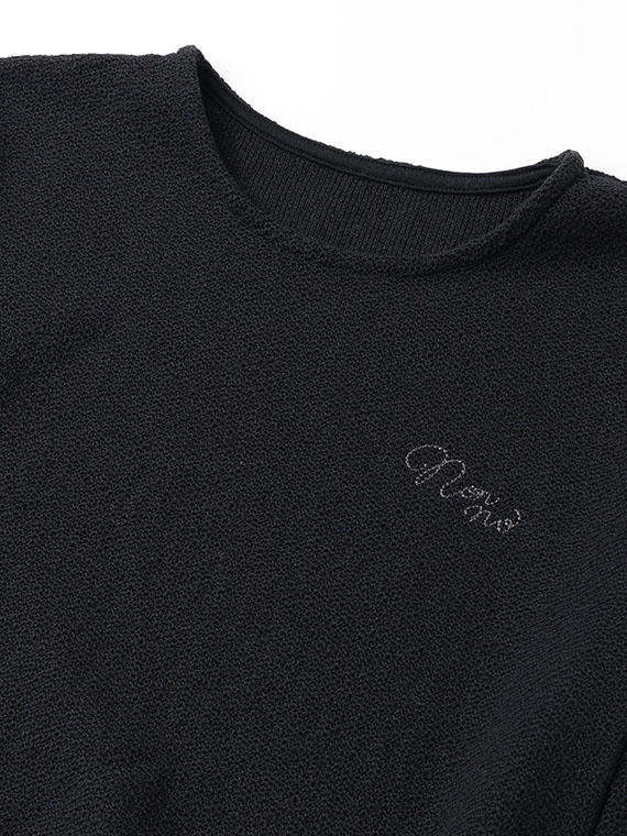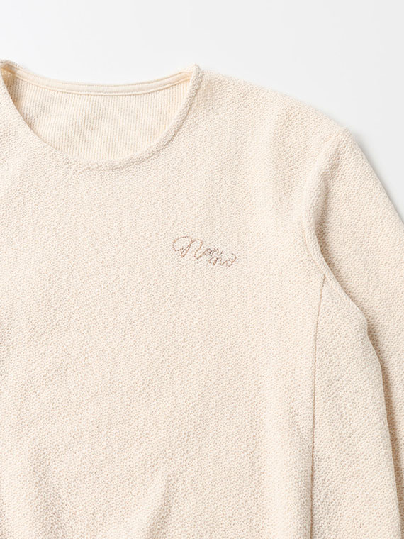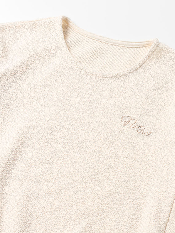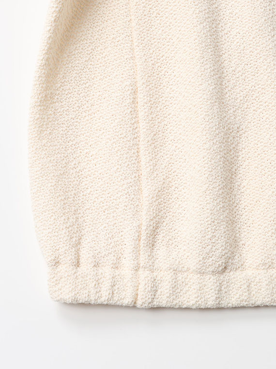 非常に稀な6Gコンピューター編み機を使用し、ニットのような丸編み素材です。6Gで太番手を編むと重くだれがちな生地になってしまうところを、糸と編み機のベストなバランスを追及しニットライクでありながら軽さと張り感を実現した素材です。粗い編み目ながら度目がしっかり詰まっているため透けにくい素材です。