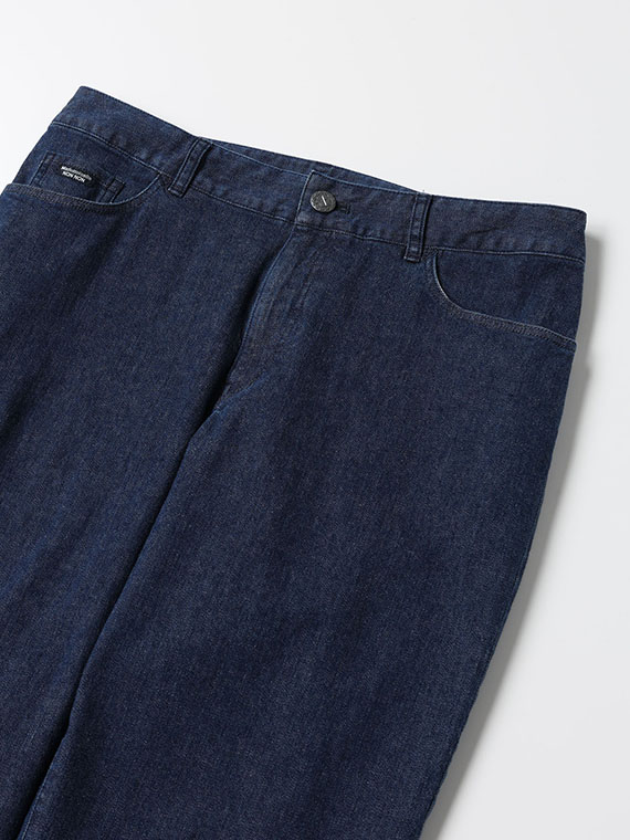 PAPAS・NONNONのシーズン定番として長年愛されているカラーデニムのベストセラー「オーガニックラフィストレッチデニム」です。この素材は、経糸に12/1のオーガニックラフィコットン、緯糸に20/1CSYを使用しています。オーガニックラフィは、大正紡績(株)が独自にブレンドした糸で、オーガニックコットンのヴァージン原料(産地はシーズンごとに最適な品質とコストパフォーマンスを基準に選定)を84%、さらに紡績工程で発生するコーマ工程の落ち綿を、リユースコットンとして16%ブレンドすることで、自然なムラ感を生み出しています。また、緯糸にはポリウレタンを綿でカバーリングしたCSY糸を採用し、ストレッチ性を付加しています。幾度も試織を重ね、打ち込み本数を最適化することで、ストレスフリーな快適な伸縮性を実現しています。NONNON・PAPAS両ブランドで何度も登場している、定番かつ優れたストレッチデニムです。