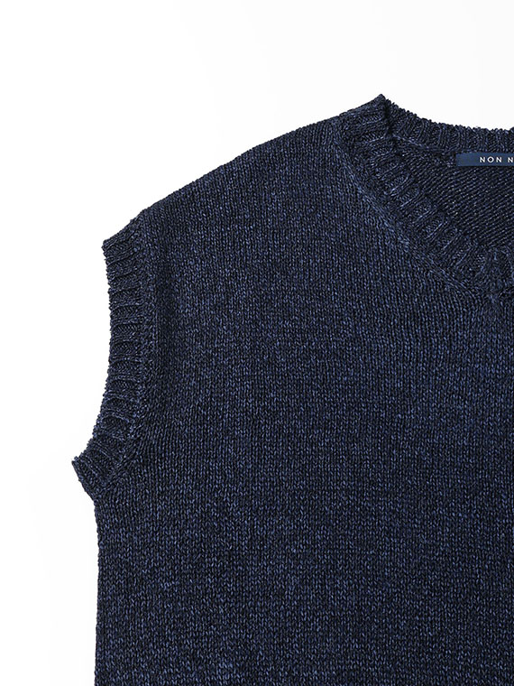 ドロップショルダーで程よい抜け感があり、ノースリーブニットとしても着用可能。