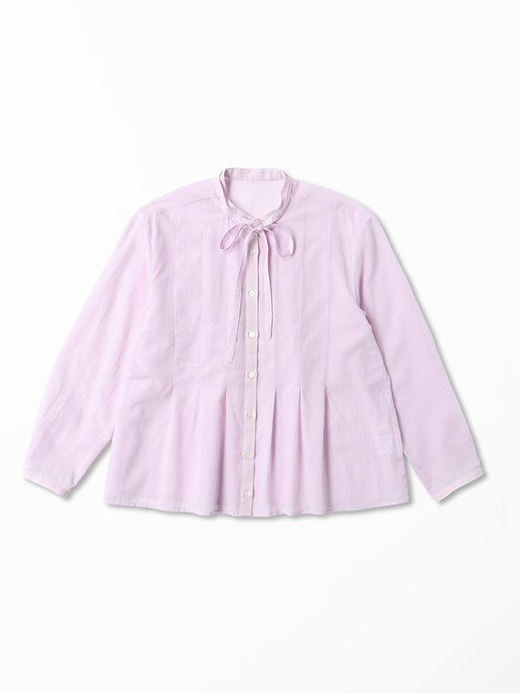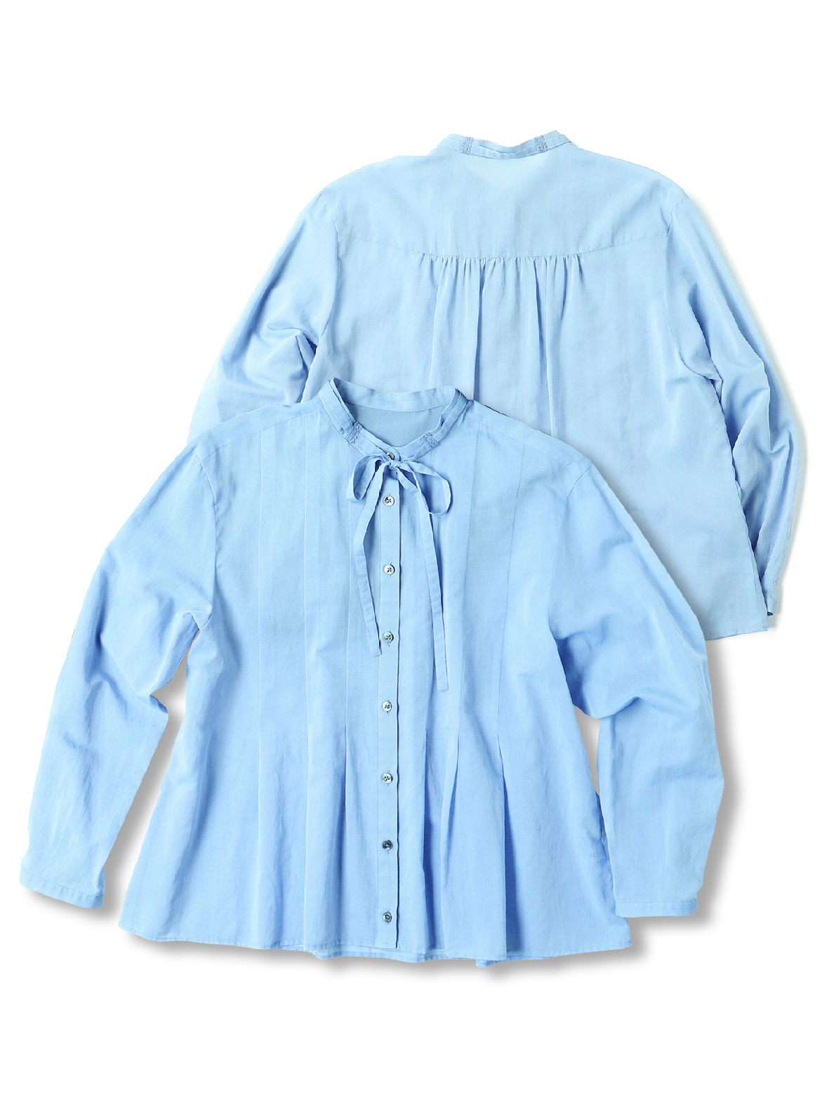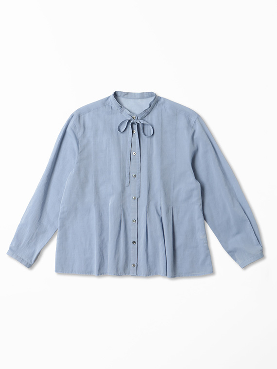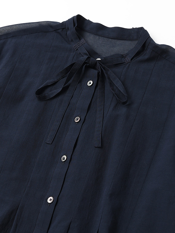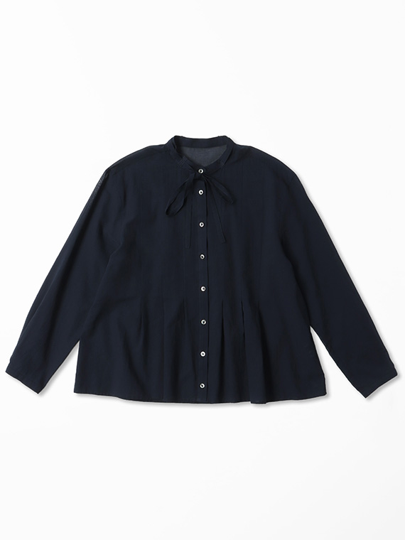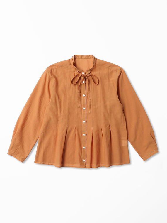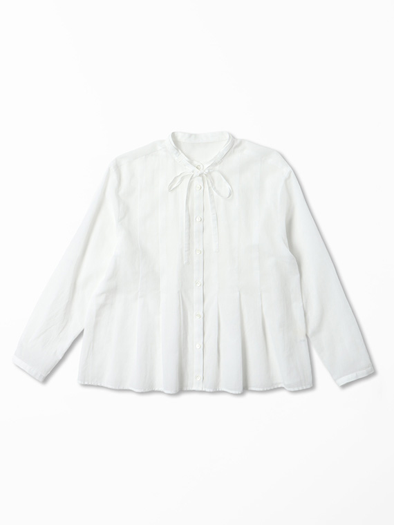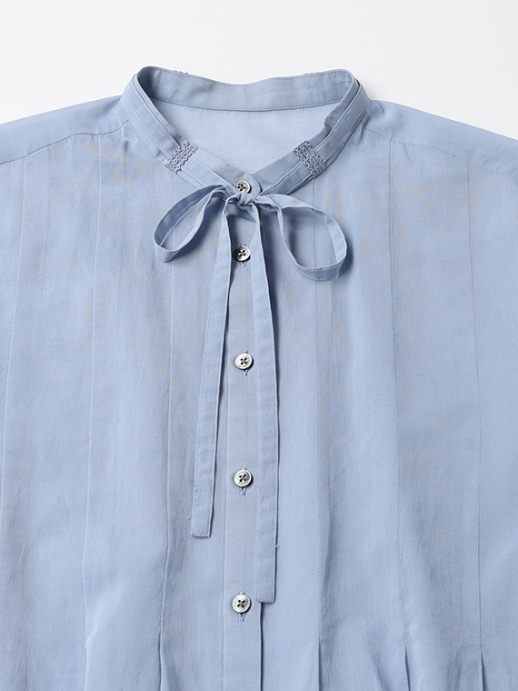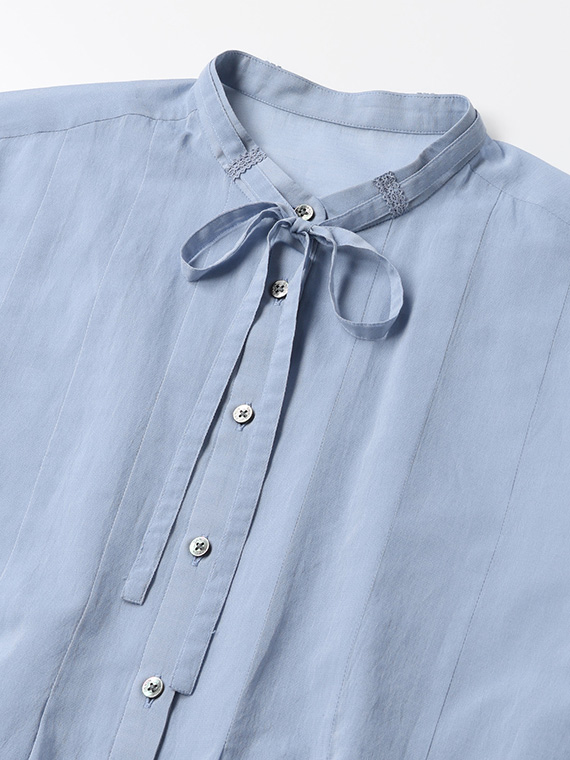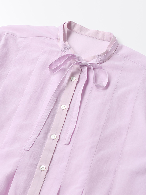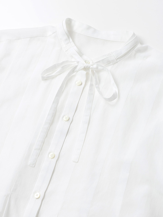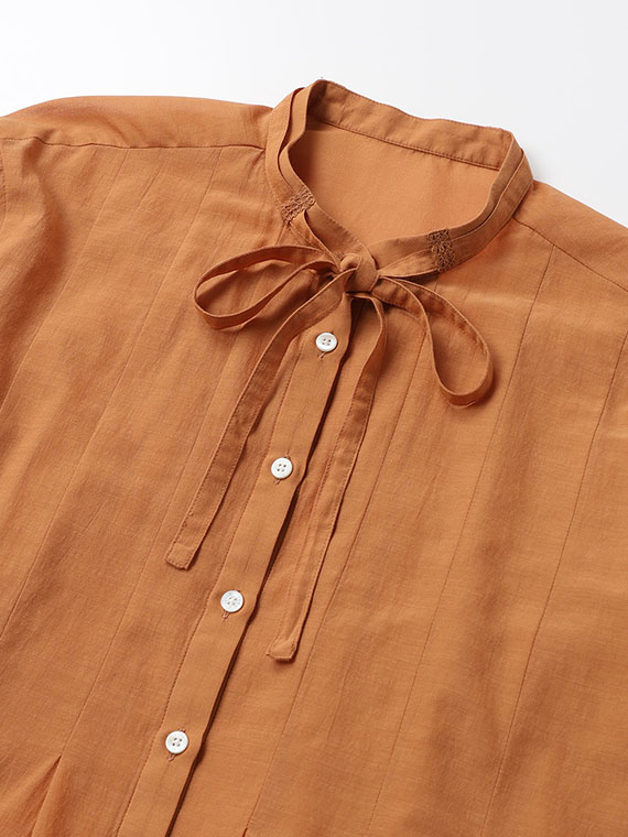 インせず着られるオーバーブラウスで、セットアップでもバランスよく決まる丈感に仕上げました。リボン付きの衿元が程よい華やかさを添えます。