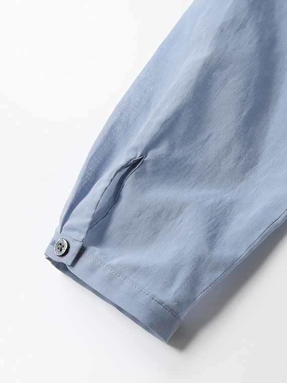 タテ糸にフィラメント糸のポリエステル50D強撚糸、ヨコ糸にコットン80/1コンパクト糸を使用し交織に配置し甘めに織り上げた平織素材です。軽量ながらタテ糸にポリエステル強撚糸を配置することによるドライな肌さわりと少し甘めに織り上げることによるシアー感が特徴のこの素材は、清涼感のある薄くて軽い春夏には最適な素材と言えるでしょう。
