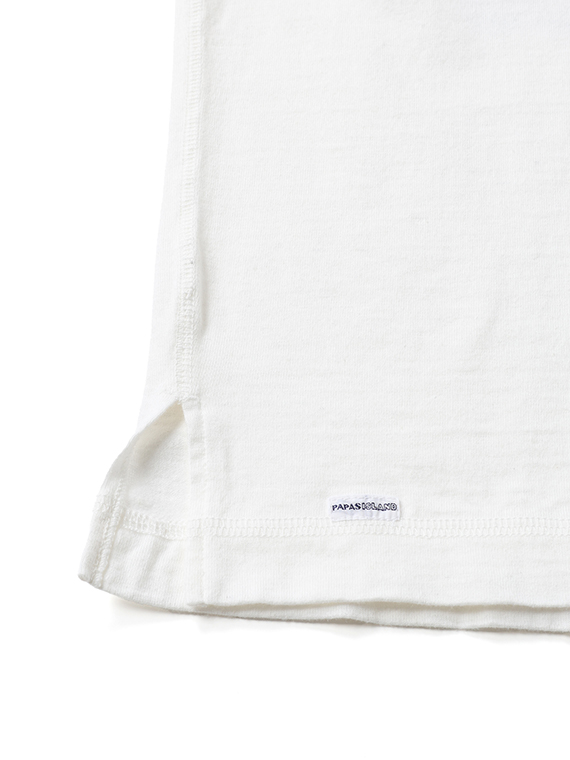 生地は、Re PAPAS PROJECTでお客様からの回収した製品をリサイクル綿として活用しています。カットソーの産地の和歌山で編み立て、大阪の染工場にてセットと仕上げをしました。リサイクル糸ならではの風合いが特徴です。