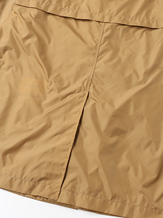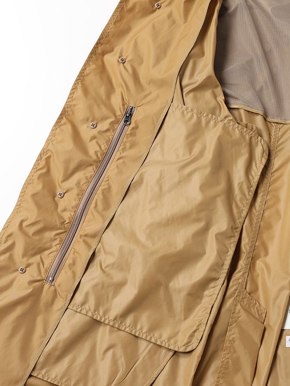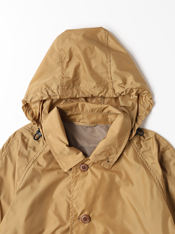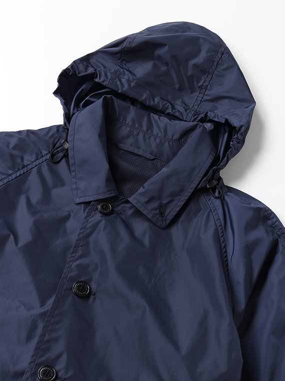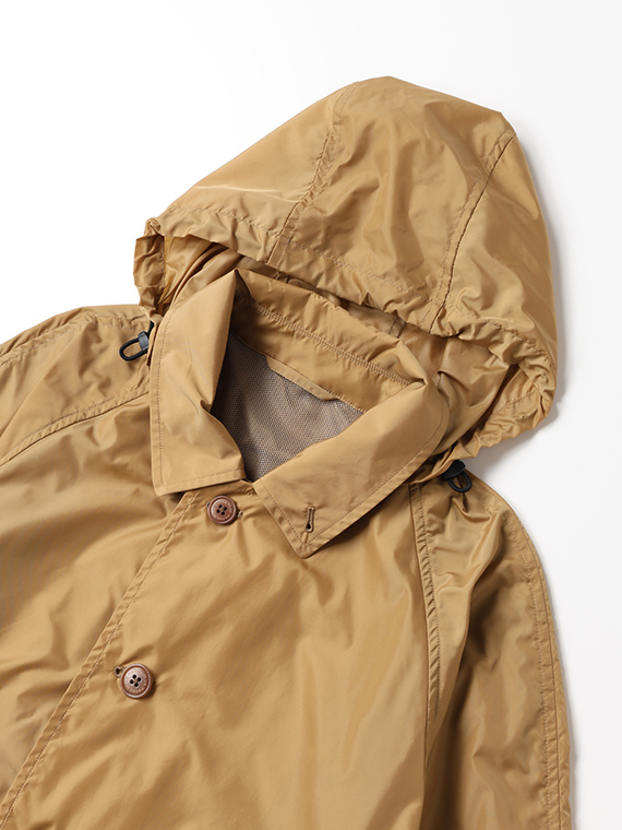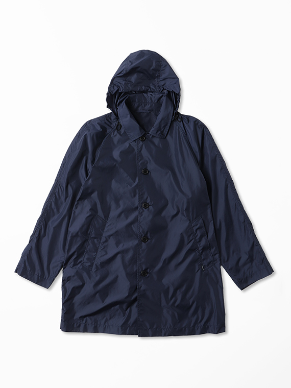 ナイロン特有の光沢感に加え、ウェット感のあるしなやかでソフトな風合いを併せ持ち、エアリーでストレスのない着用感を実現しています。ベーシックでありながら素材の存在感が際立つ、長く愛用できるアウターです。
