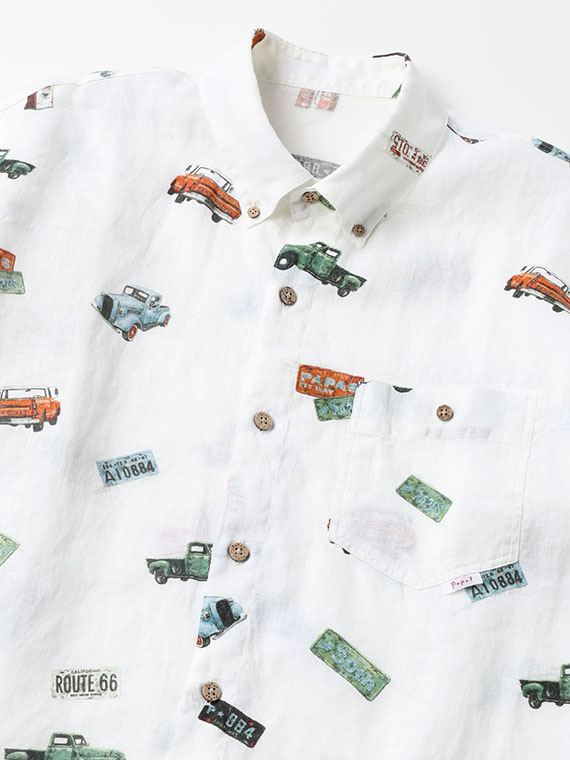 ピックアップトラックのモチーフを全面に配したプリントは、大人の男性の遊び心を感じさせます。シャツのデザインも当時のアーカイブをもとに再構築し、オリジナルのディテールやサイズ感に近づけています。1枚で主役になる存在感があり、春夏のカジュアルスタイルに軽快なアクセントを加えてくれる一枚です。