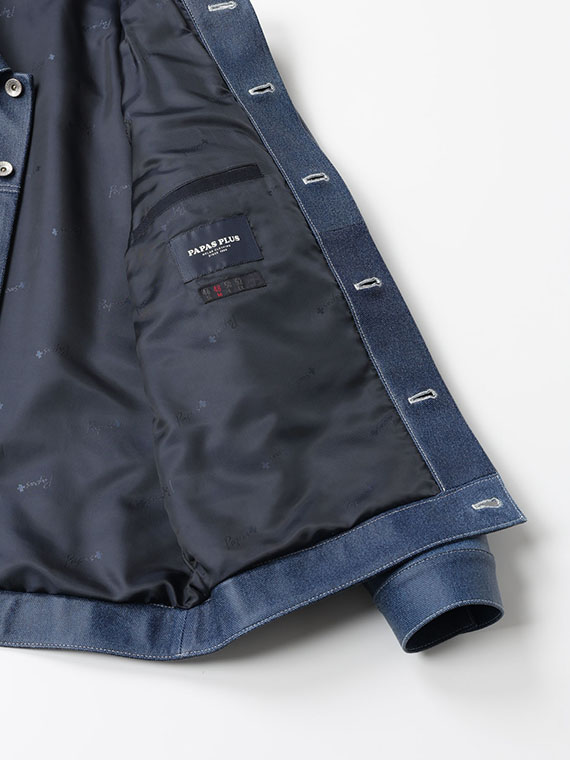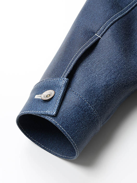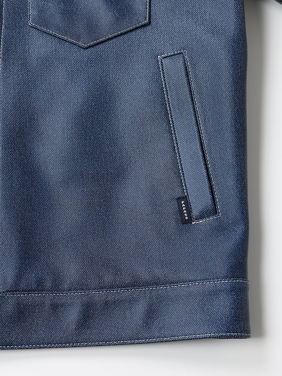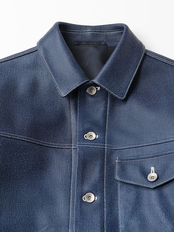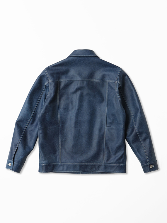 左胸のフラップポケットやネオバー釦、配色ステッチが程よいアクセントとなり、カジュアルさの中に存在感を添えています。デニムライクな表情でまとめることで、革アイテムでありながら気負わず着用でき、スタイリングの幅を広げてくれる一着です。