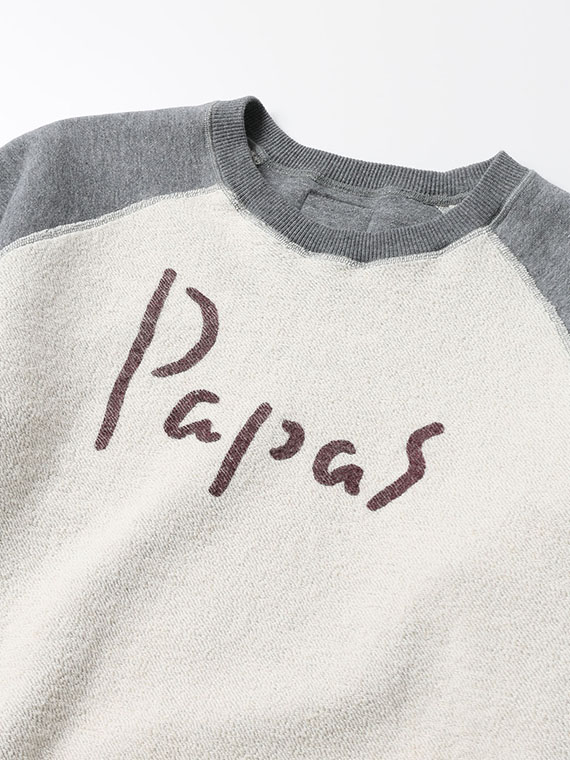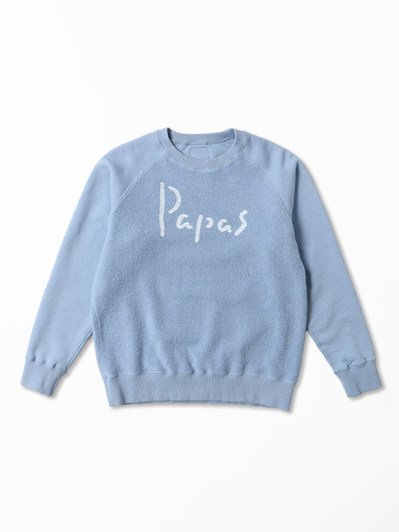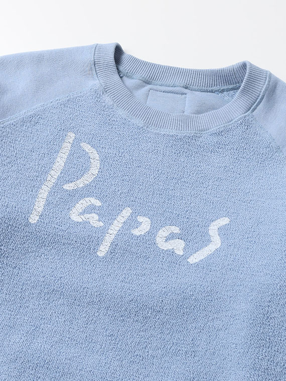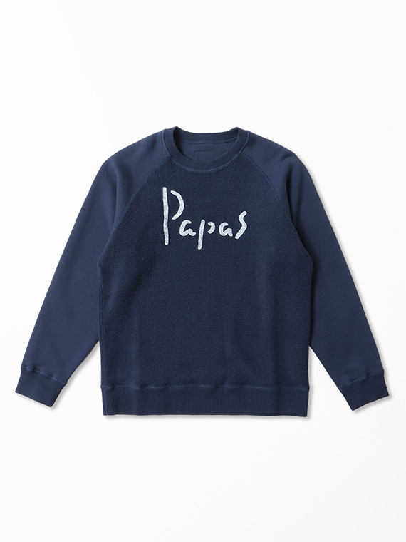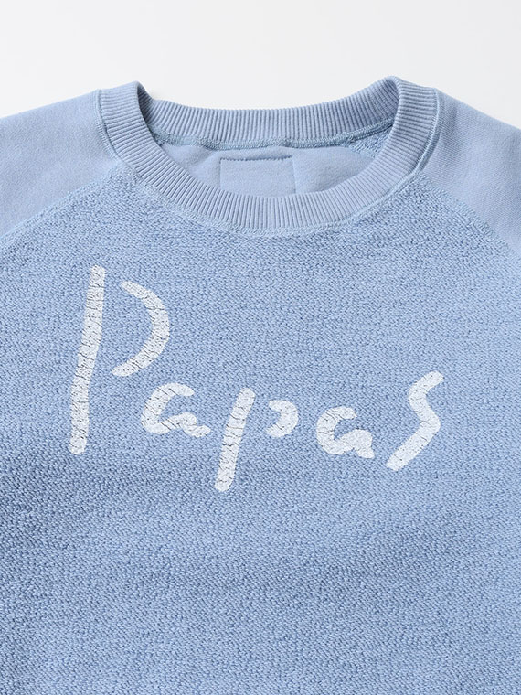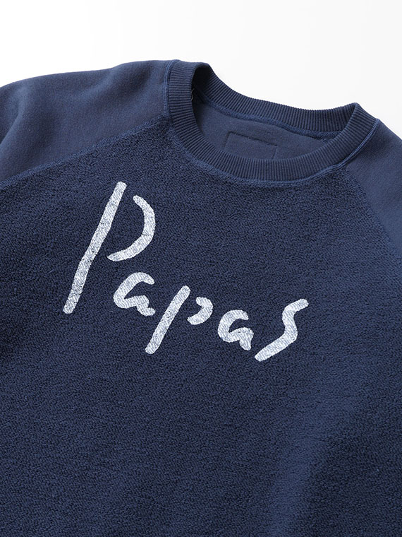 吊り編みは一度に編める糸の量が少なく、1反仕上げるのに数日を要する製法ですが、その分、糸に余計な負担をかけず、ふっくらとした柔らかな生地に仕上がるのが特徴です。裏糸には一般的な太さよりも太い7番手の糸を使用し、素材にはメキシコ綿ホワレスを採用。ほどよいコシと素朴な風合いがあり、立体感のあるパイルがPAPASらしい表情を生み出しています。
