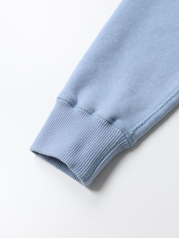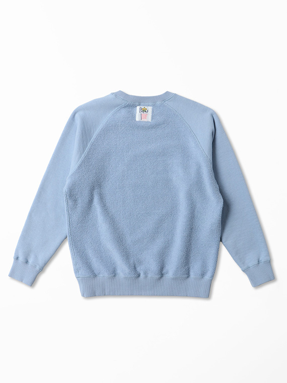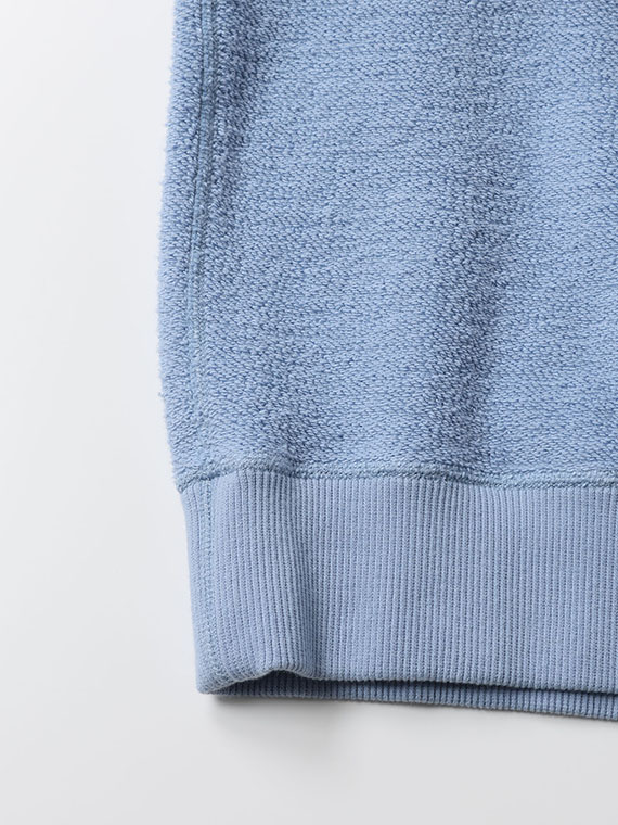 本商品は、そのパイル面をあえて表側に使用し、前後身頃を裏使いにしたデザイン。胸元にはロゴプリントをあしらい、素材感と遊び心を活かした一着に仕上げています。着込むほどに身体になじみ、長く愛用していただけるトレーナーです。
