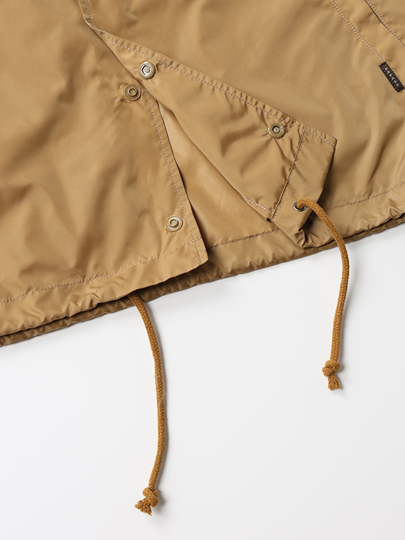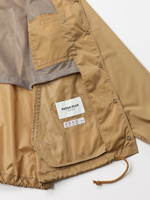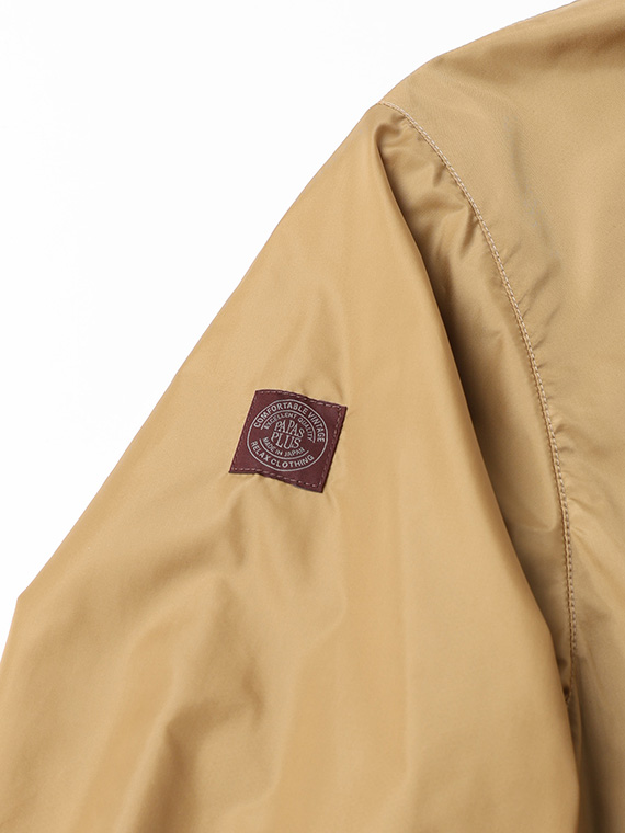 生地は、タテ・ヨコともに50デニールのナイロン糸を使った、ほどよいハリ感の高密度タフタを使用しています。しっかりと織り上げることで、ナイロンならではの表情とコシを持たせつつ、しなやかでやわらかな風合いを感じていただけます。光沢は強すぎず、ほんのりとした艶感が上品なアクセントに。軽量で空気を含むような着用感も魅力です。