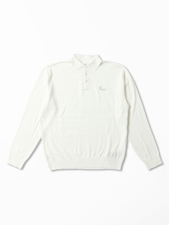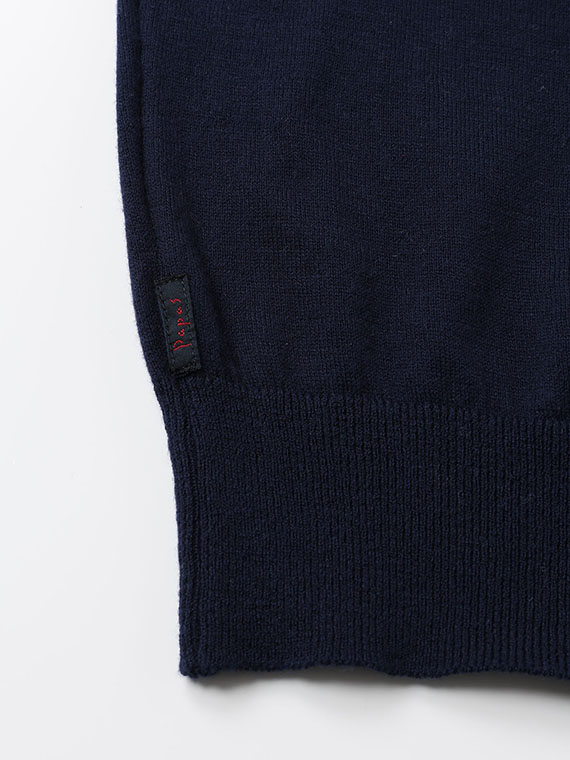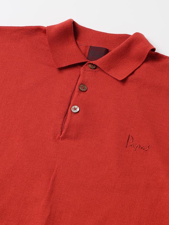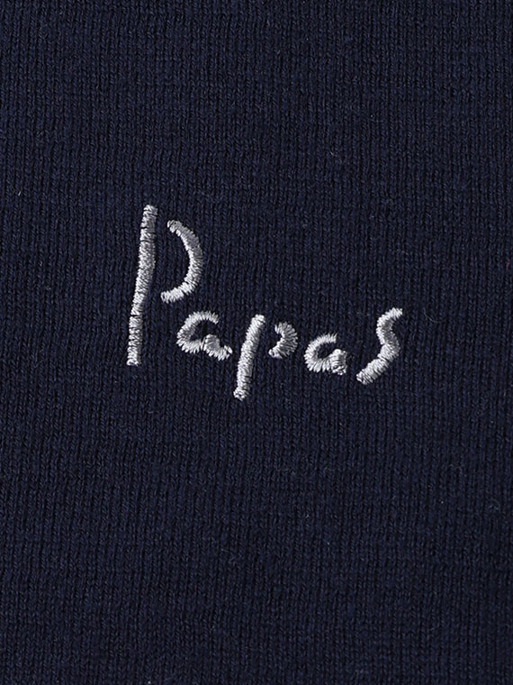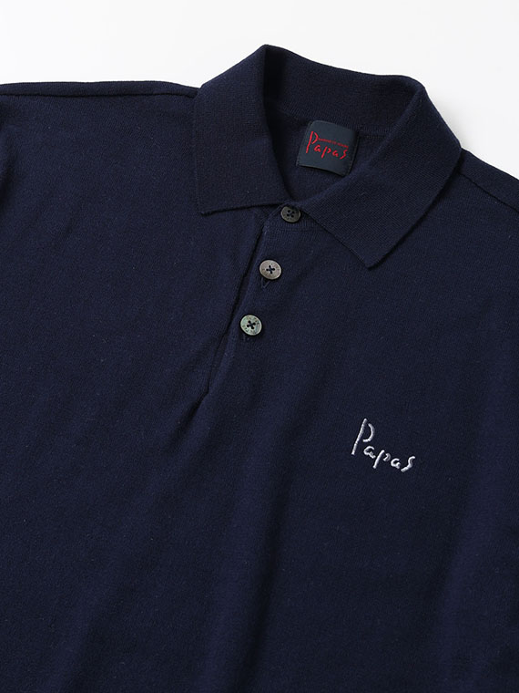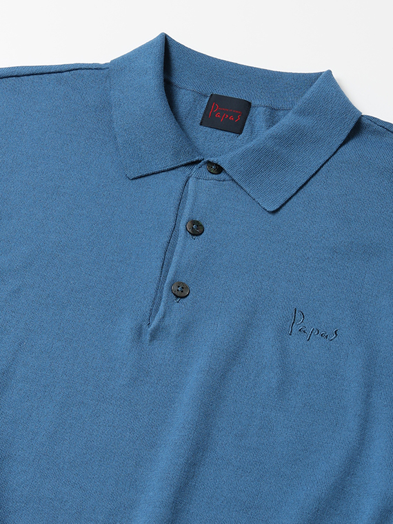 襟元は端正な表情のポロカラーを採用し、前立てには品のあるボタンを配することで、カジュアルになり過ぎない印象を演出します。左胸には「Papas」のロゴ刺繍をさりげなくあしらい、ブランドらしい落ち着きと存在感をプラスしています。