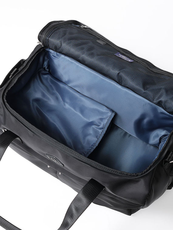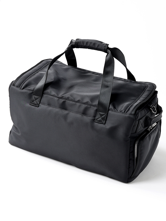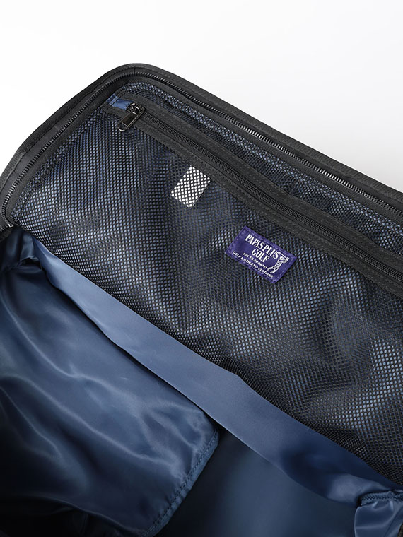 天蓋裏にはメッシュポケットを備え、小物類の整理にも便利。前胴には分割ファスナーポケット、背胴にはマグネットポケットを配し、使用頻度の高いアイテムをスムーズに出し入れできます。左側面にはシューズ専用ポケットを設け、ウェアやタオルと分けて収納できる実用的な設計です。左右側面のハンドルや底鋲など、持ち運びや置きやすさにも配慮しています。