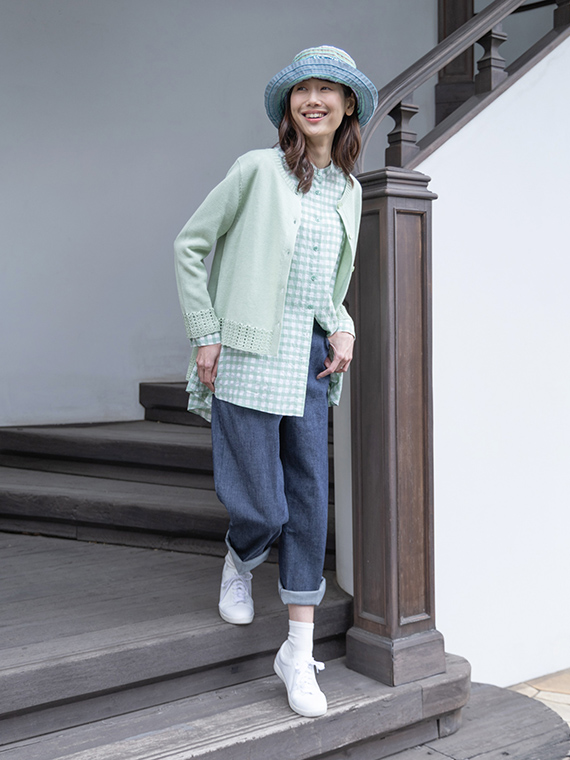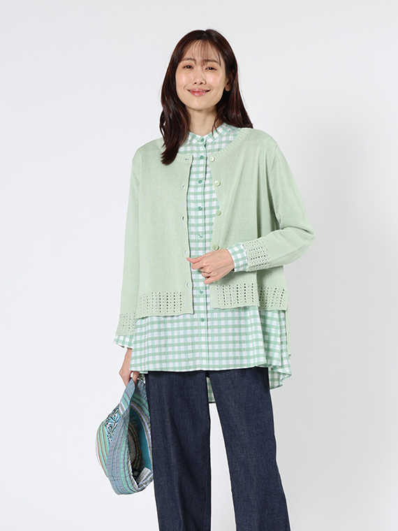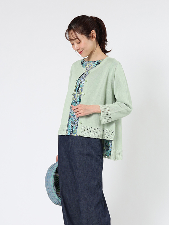 お顔周りを優しく見せるラウンドネックは、お気に入りのネックレスを飾るのにもぴったり。少し特別な日のお出かけにぜひ羽織っていただきたい一着です。