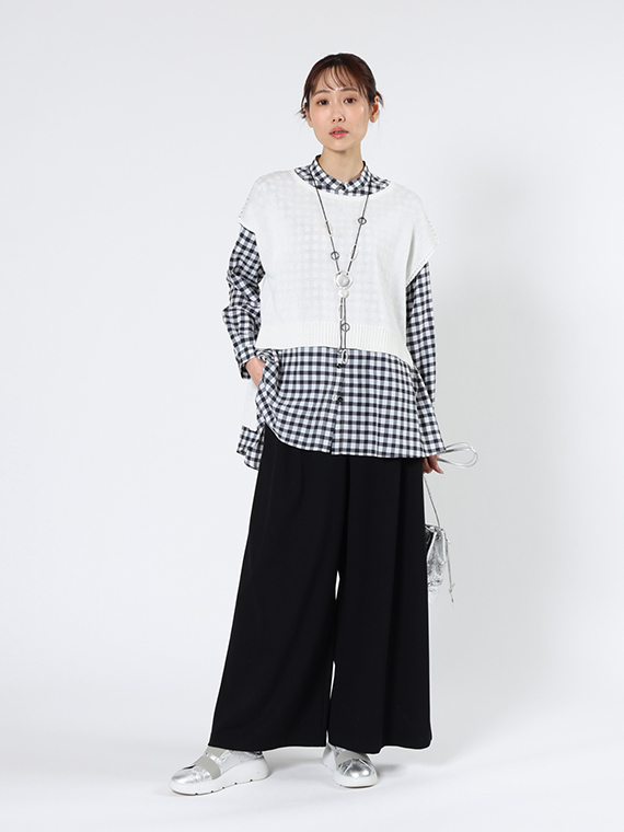 この大胆な着丈の差をサイドのスリットが美しくつなぎ、横から見た姿もハッとするほど印象的です。