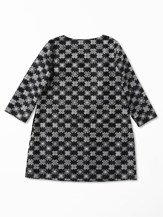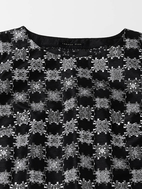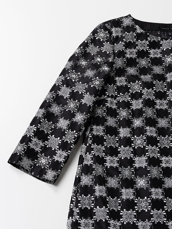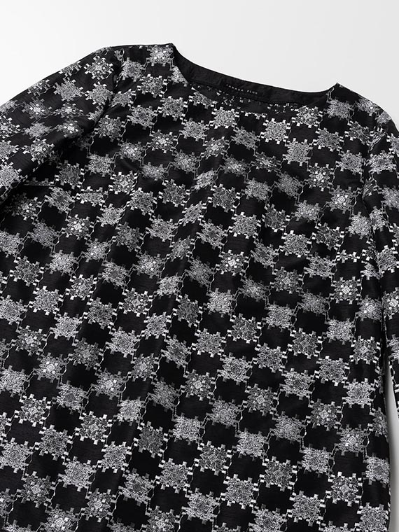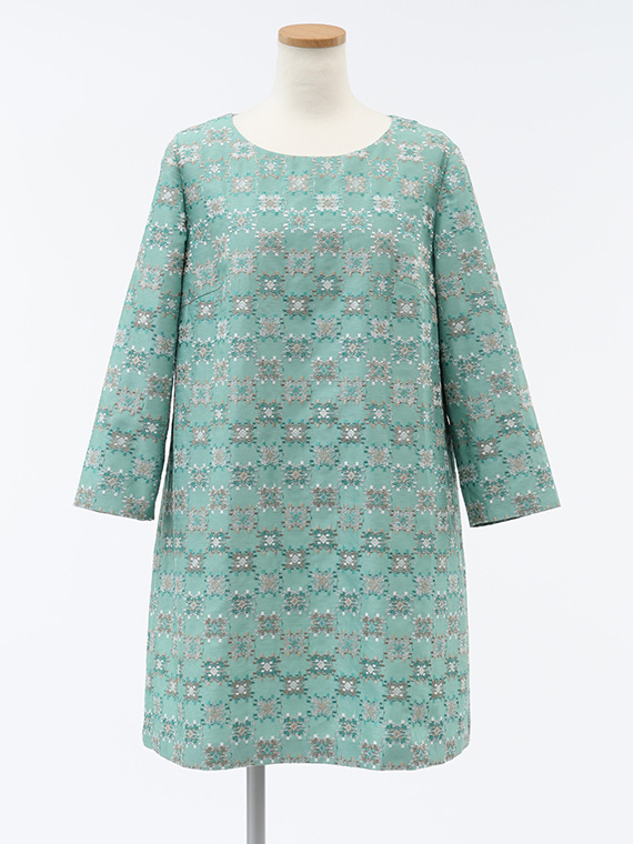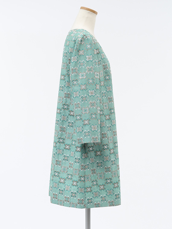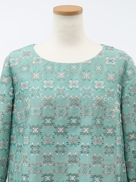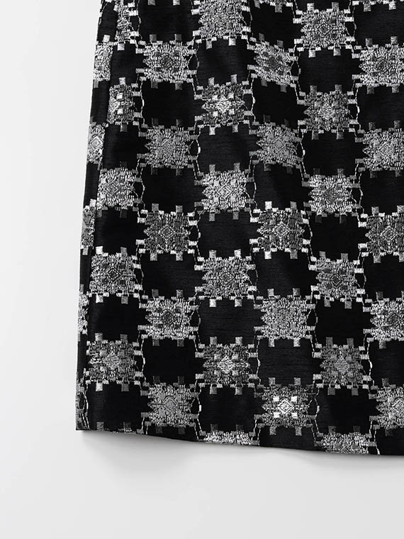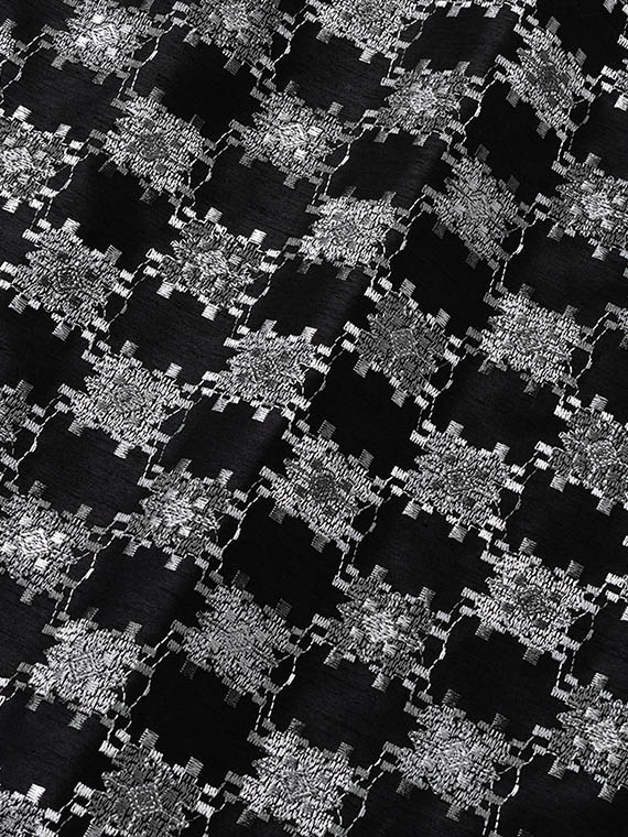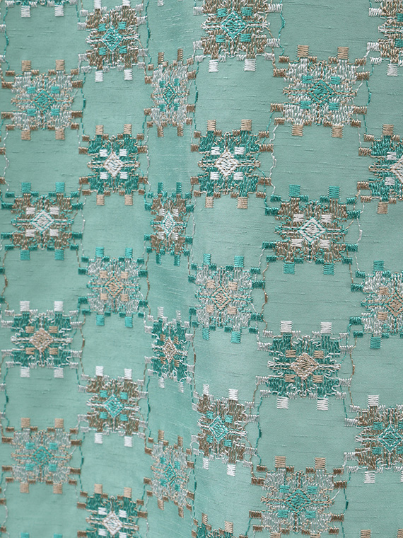 つむぎ風の不規則な節(フシ)が横方向に走るシャンタン生地は、光の当たり方で表情を変える上品な光沢が魅力。その上に、3色の光沢ある細いレーヨン糸を使い、緻密な幾何柄を刺繍しました。