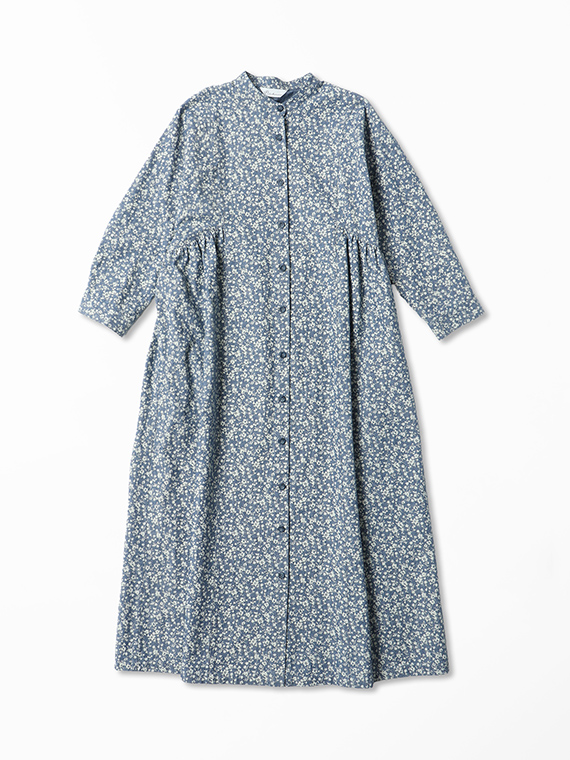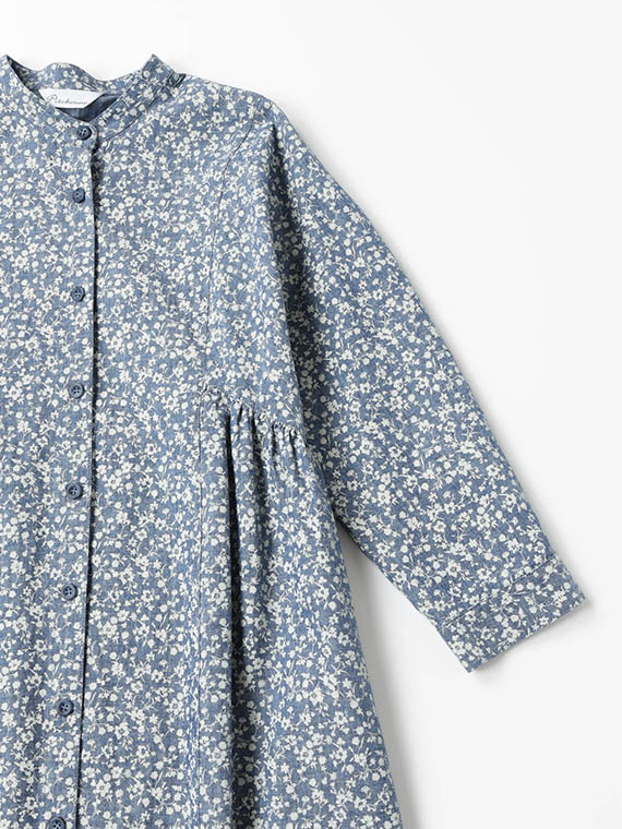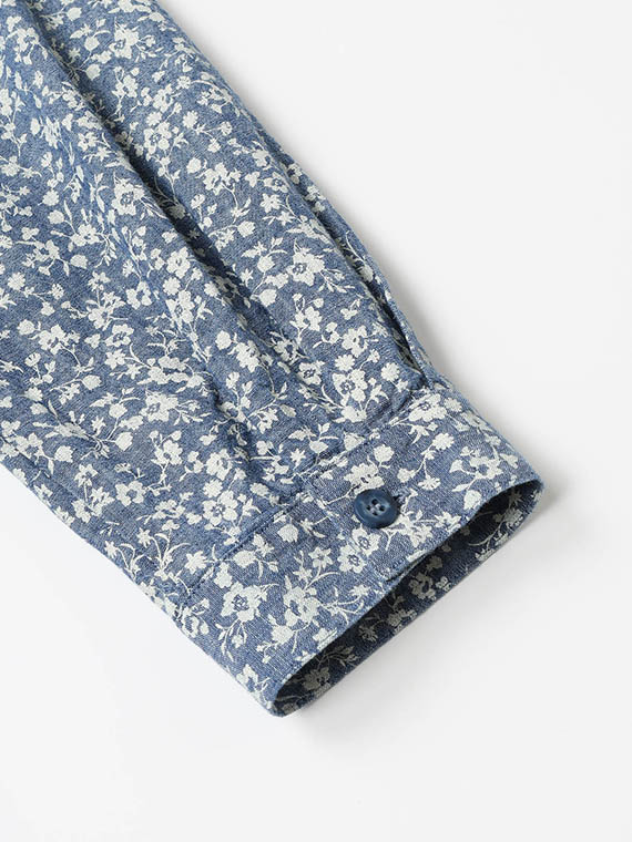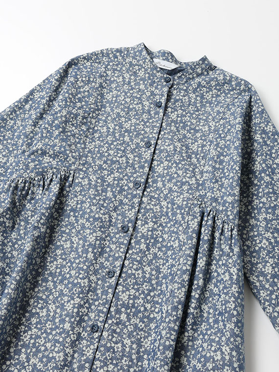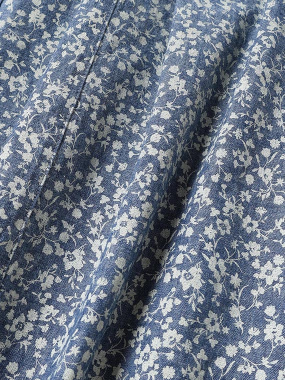 シャンブレー調の奥行きのある生地に、顔料で繊細な小花柄をプリントし、さらに製品洗いをかけることで、こなれた質感に仕上げました。