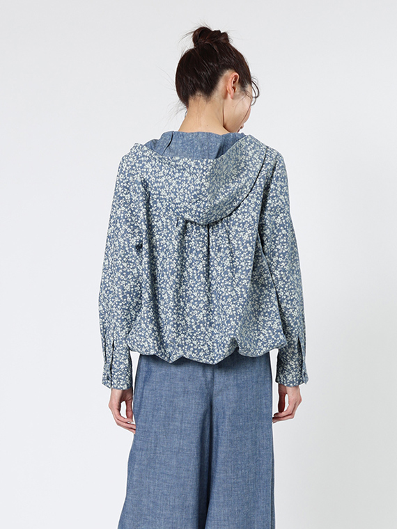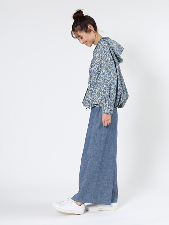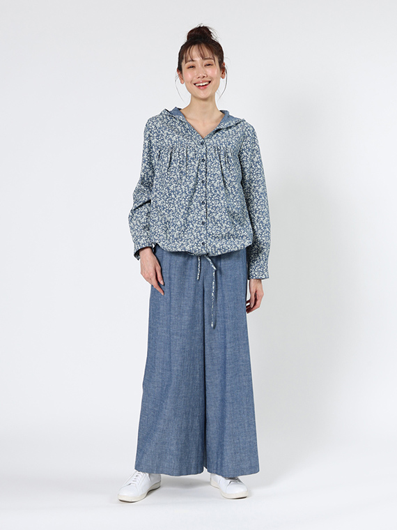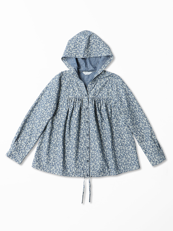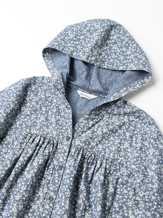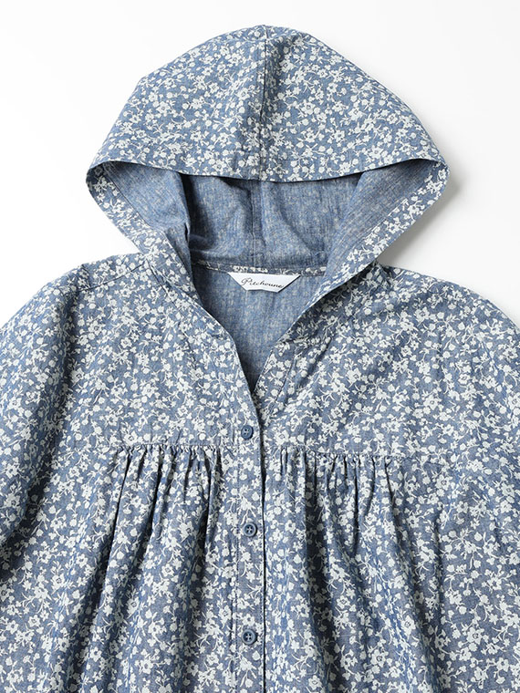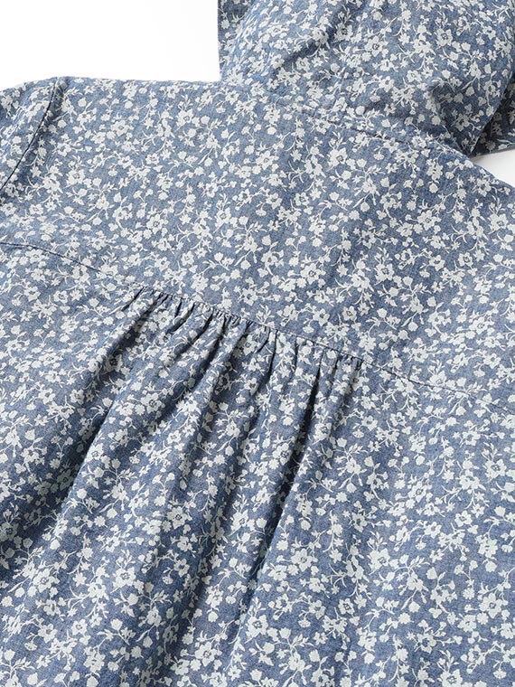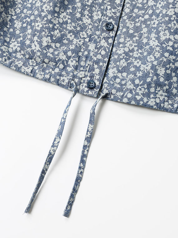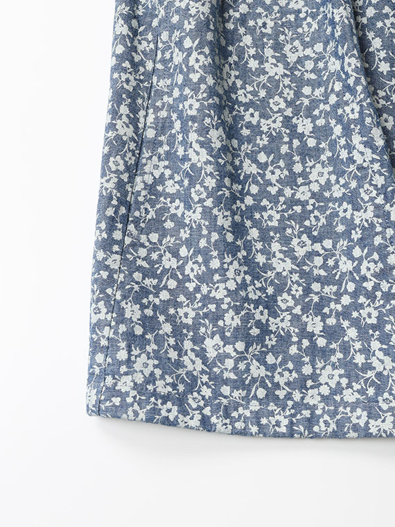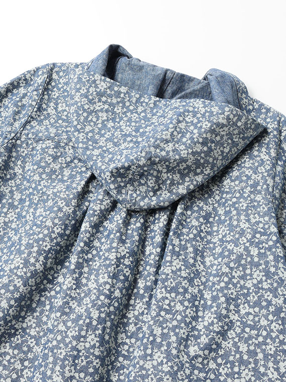シャンブレー調の奥行きのある生地に、顔料で繊細な小花柄をプリントし、さらに製品洗いをかけることで、こなれた質感に仕上げました。